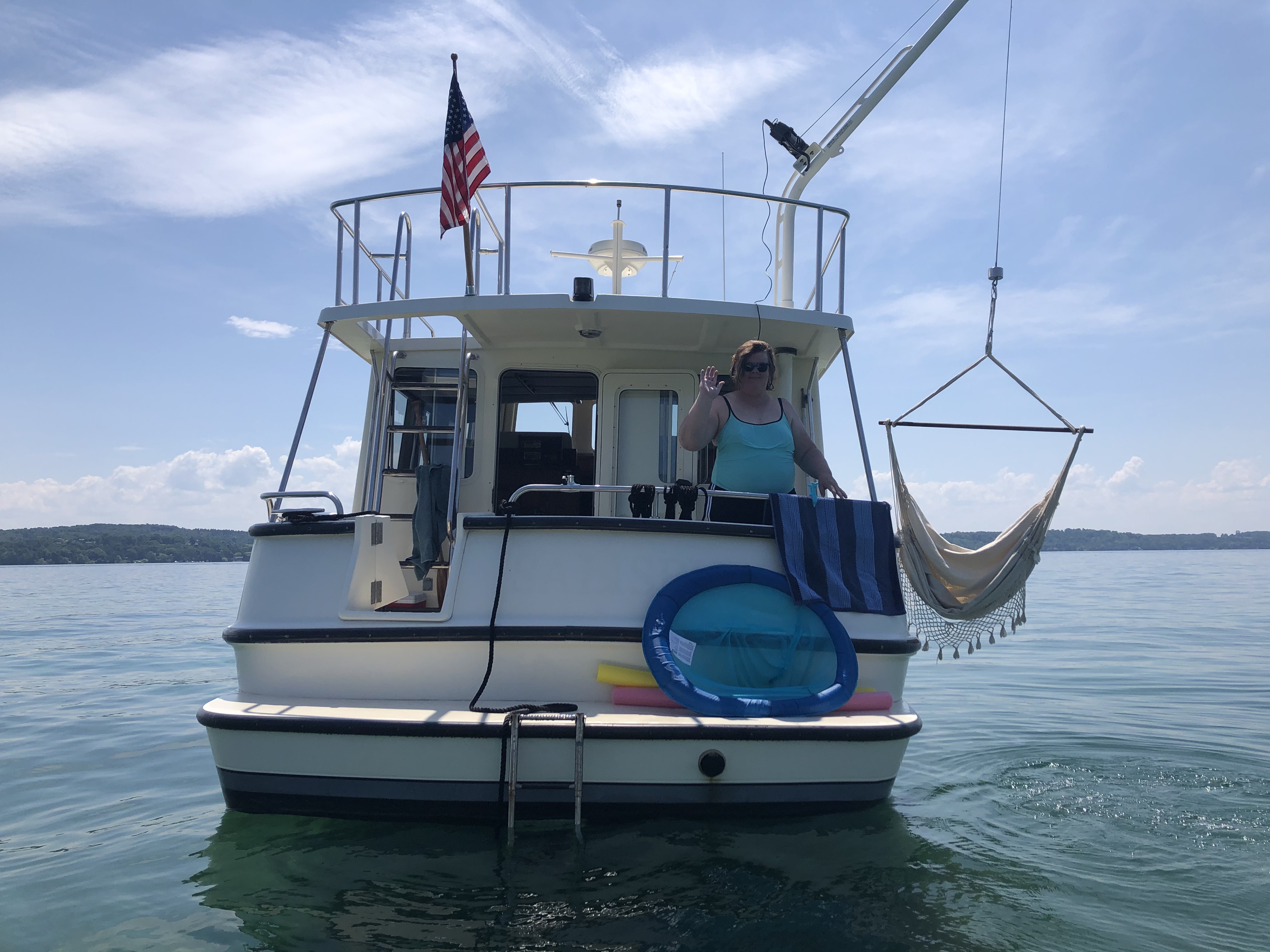 May 2020 – Early May brought a phone call from Jay telling us he had found our boat! A rare(-ish) Single cabin NT37 came on the market. It was a boat Jay had sold originally and new it had been well maintained. We looked at the provided photos in the listing then with Jay’s help we submitted an offer contingent on survey results. Based on an agreeable counter offer Jay and Tim headed south to Savanah, GA to see the boat and have the survey done. The next week the boat was on a truck and delivered to Traverse City, MI