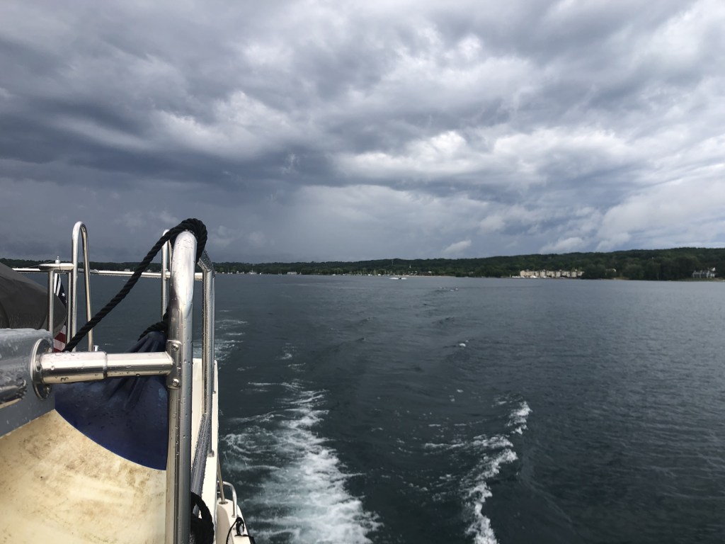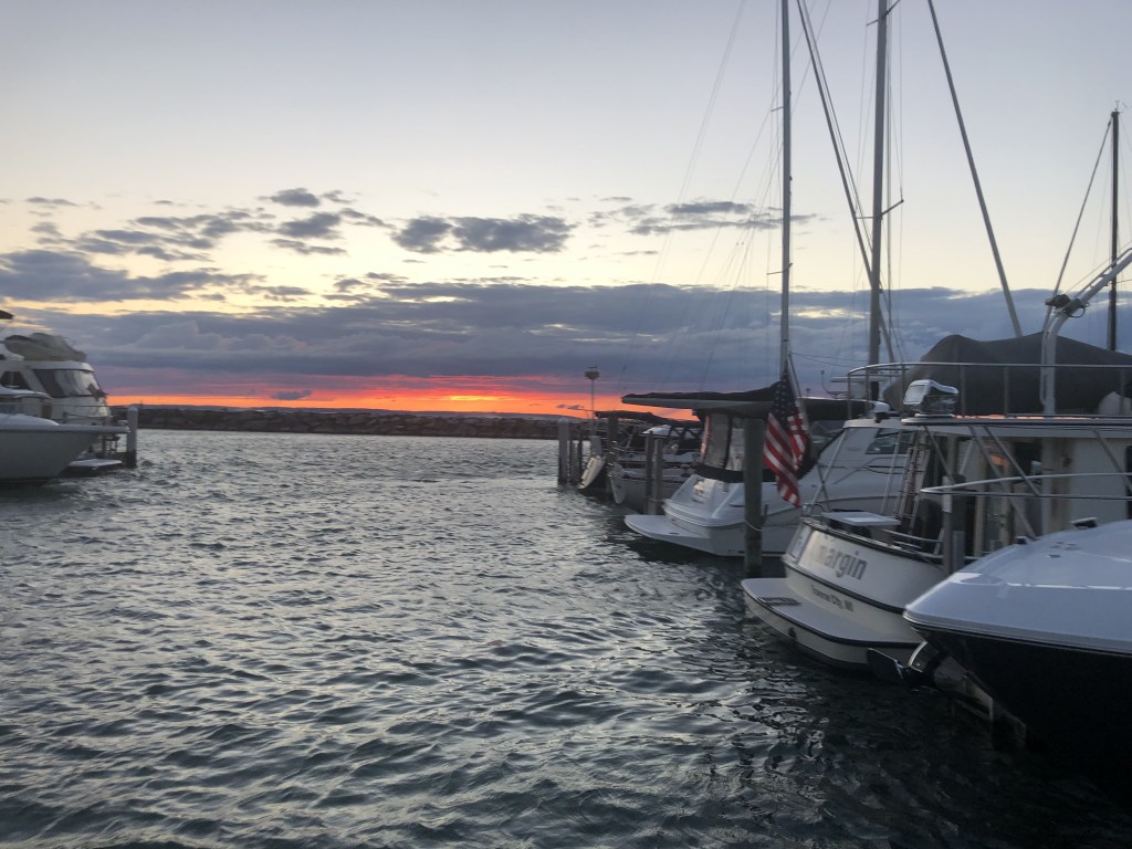 Sunday ( 7/24) we left early (7:13) hoping to make it to Frankfort with a bail out plan of Leland should the weather not cooperate. The plan fell apart when we came across an unoccupied aluminum boat floating in Grand Traverse Bay. We notified the Coast Guard and they asked us to wait on scene until they arrived. We where Just east of Northport and they sent a small boat from Charlevoix and helicopter from Traverse City, both arriving at the same time. With that excitement past we moved on as they continued the search, not knowing if someone fell off or if it just broke loose from a dock and drifted away. We arrived at Leland at 12:45 with waves building to 2-3 feet and a long way to go to Frankfort. A tour of the town and a nap filled the afternoon. Dinner on the river and a relaxing evening of reading filled the evening topped off by a spectacular sunset.