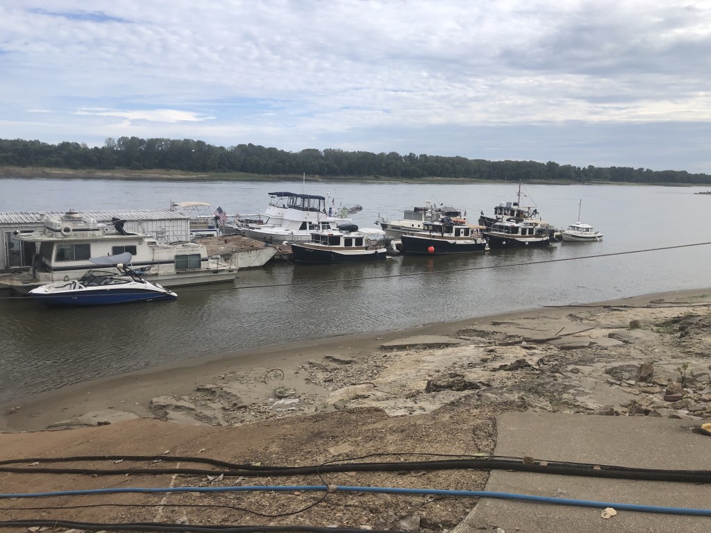 Thursday we began the long trek to Paducah, KY. Between Alton Marina and Paducah there are only two places to tie up for the night and its a long haul and not one I was looking forward to. We started traveling this part of the adventure with 3 Ranger Tugs and a Lord Nelson Victory Tug—We are the tug convoy. We left Alton at 6:30am after the lock-master at Mel Price Lock and Dam gave us the go-ahead. Smooth “sailing” thru that lock, the Chain of Rocks L&D and then St Louis.