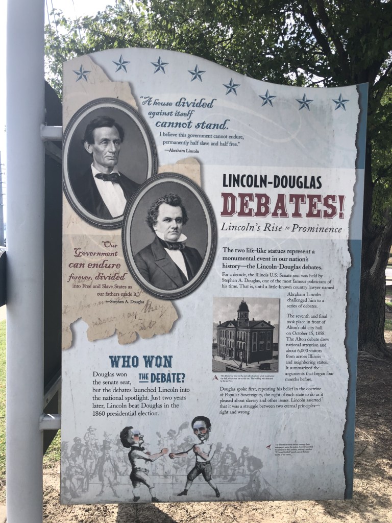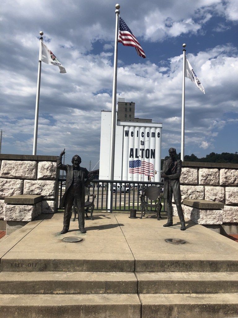 After two nights in Grafton, we motored 20 miles to Alton. Now we are really on the Mississippi. The Illinois side of the river has high rock hills, but the Missouri side is mostly flat. I can only image what the river does to that side during flood stage. Alton Marina is our home for the next 4 nights and the slips are covered as well. The temps continue to be in the 90’s so the covered slips are a bonus. We wandered the city, at least the part accessible by foot. There is a spot in the city commemorating the debate between Douglas and Lincoln. As you can see by the stand that each man took, our country is at another divide. Who will lead us??