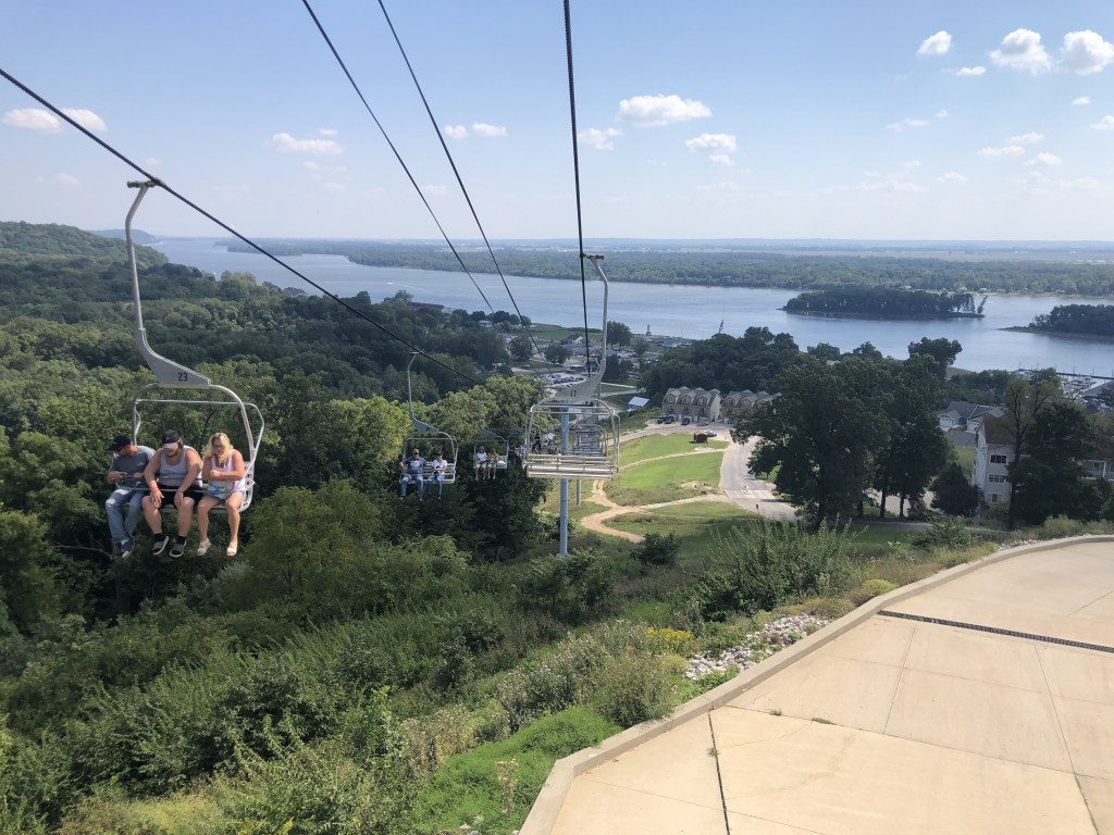 The city of Grafton is a very unique small town. I believe the population is about 600, but on the weekend the population swells to the thousands. People from St. Louis come here to party and get away from the big city. There were 4 or 5 bars with live (load) music playing within site of the marina. On Saturday, during the day, we took the chair lift to the top of the mountain for a spectacular view of the confluence of the Mississippi and Illinois River. There were many small shops on the Main Street in Grafton which we visited. I was really intrigued by the small town feel of Grafton. I wonder what it would be like to live here and have the Mississippi keep me guessing as to what it might do next..like the flood of 1993 when most of Grafton was under water.