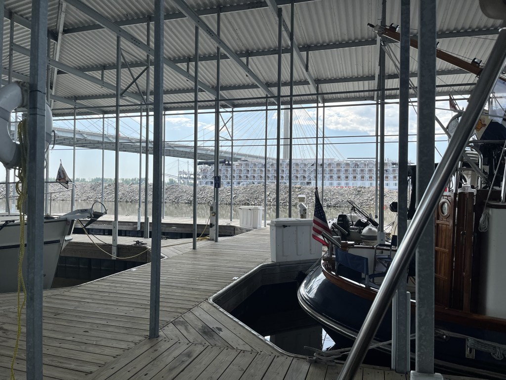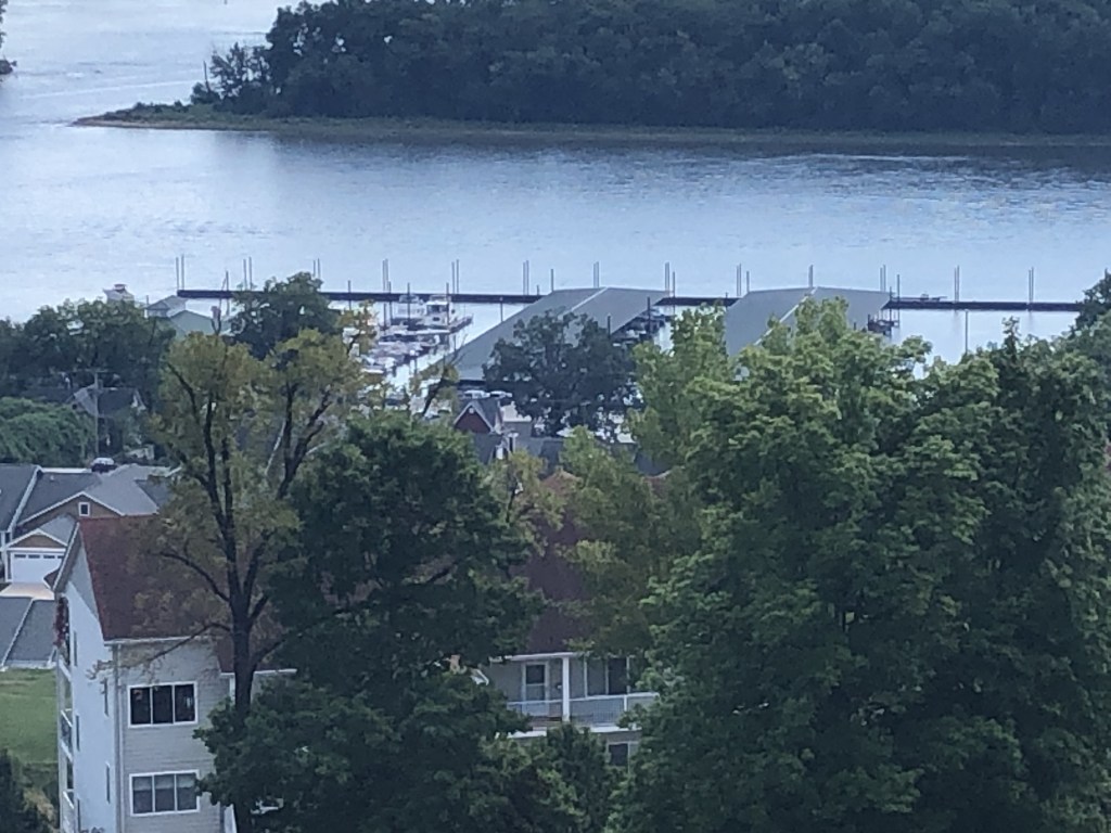 The distance from Mel’s to Grafton is about 20 miles. Right at Grafton, the Illinois joins the mighty Mississippi. We turned into Grafton Marina just after entering the Mississippi River. No anchoring out for 6 nights!!!! (2 at Grafton & 4 at Alton YEAH!!! And to top it off, our slip was covered–which apparently is a thing around here. That covered slip was a added blessing as the temp’s this week are in the 90’s. One of the mornings there was a storm and we could watch the rain falling from our boat deck and not get wet….a very strange sensation.