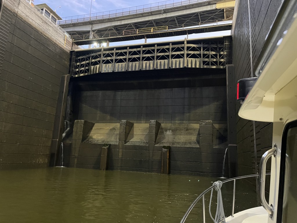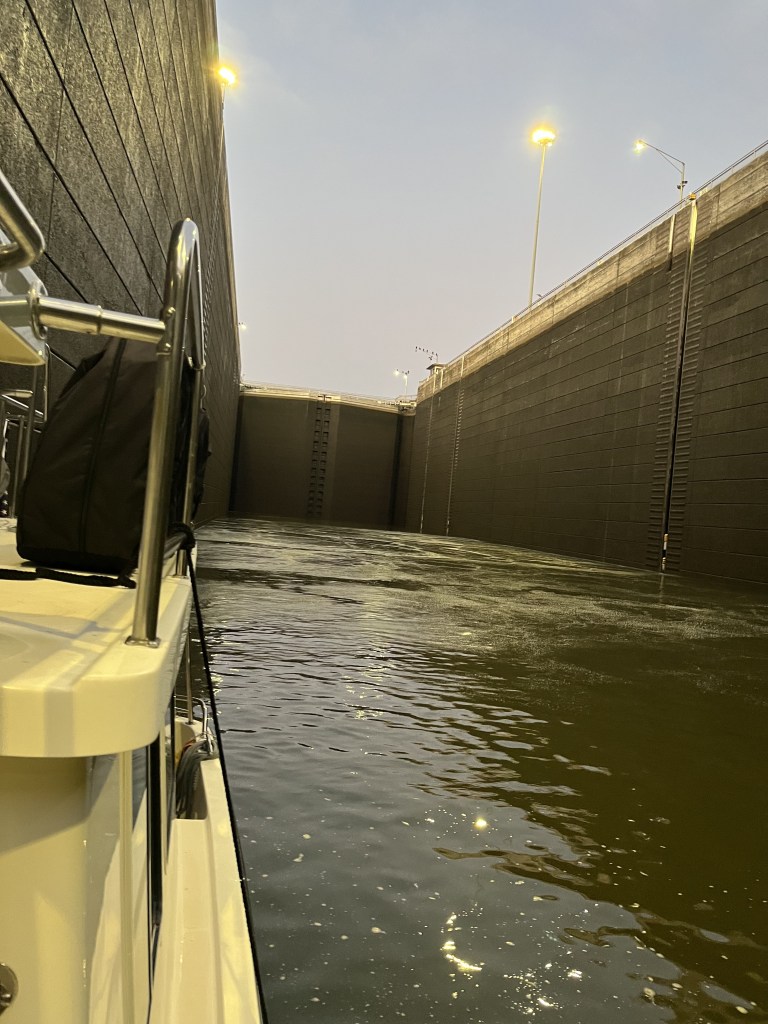 Pickwick Lock and Dam–We only waited a few minutes before getting the green light to enter the lock. This lock lifted our boats up 55 feet to the level of Pickwick Lake.