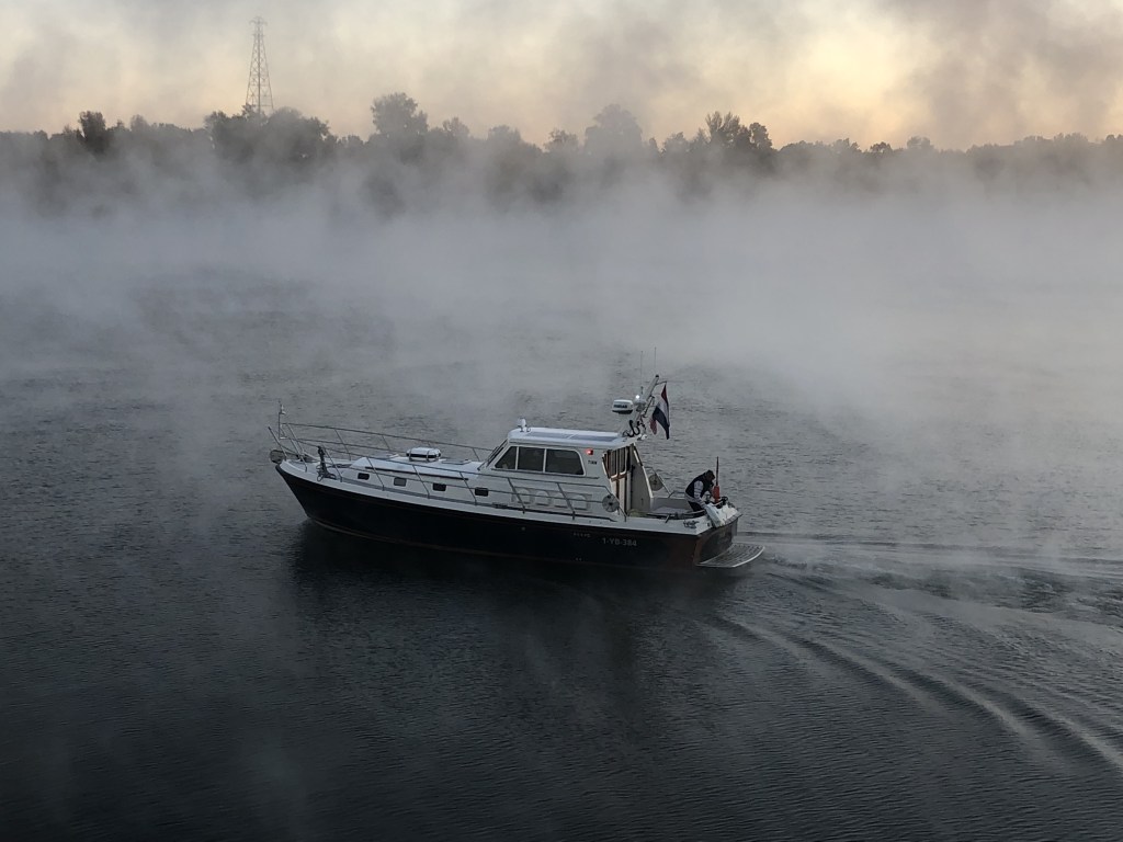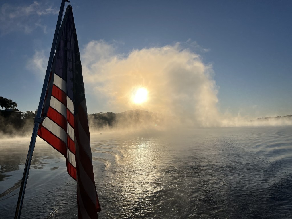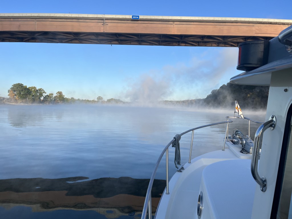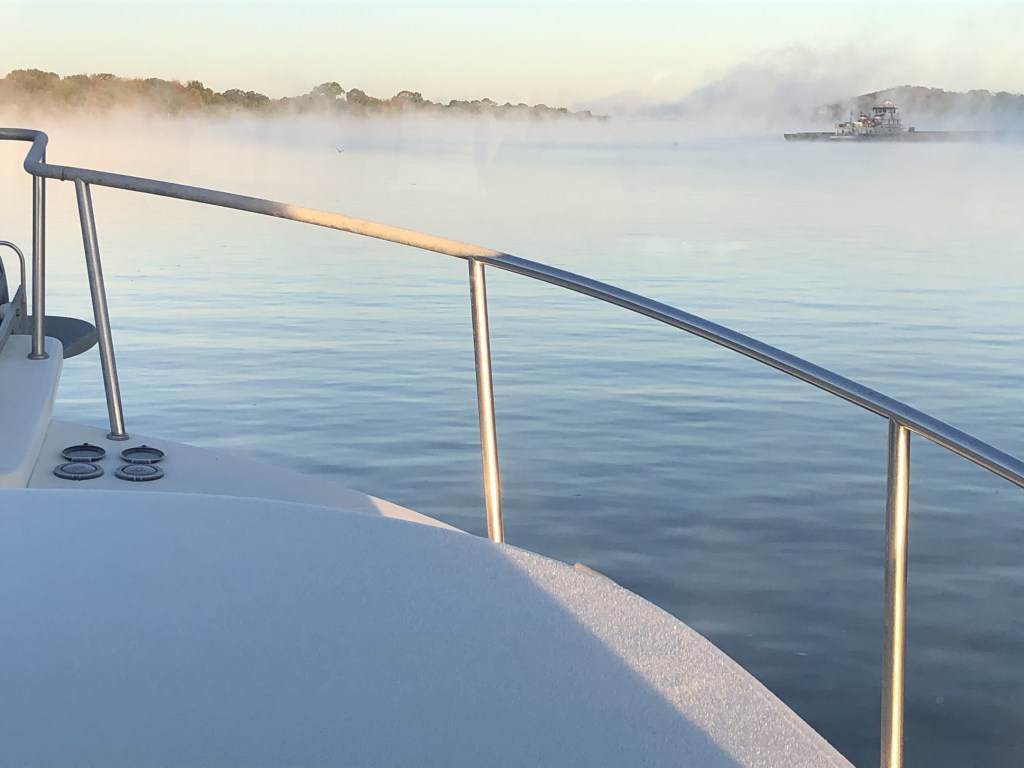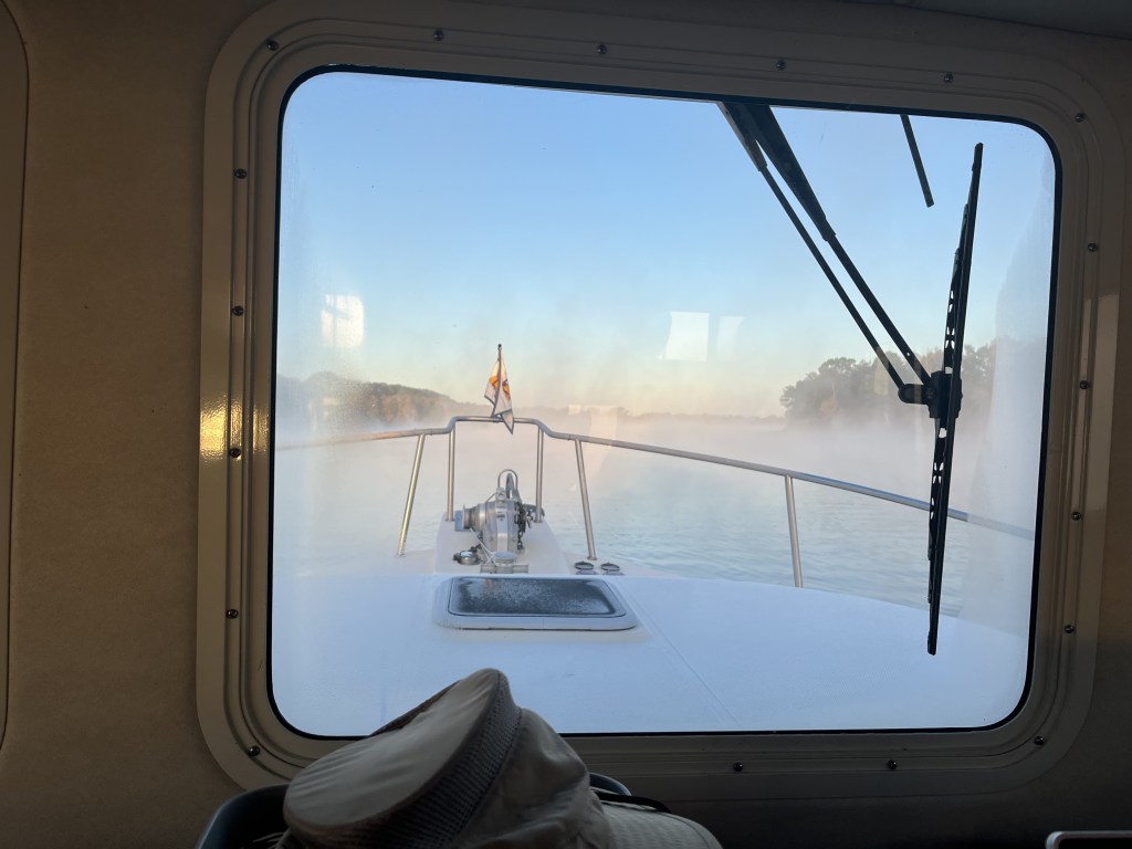 Clifton, leaving in Frost and Fog–This morning there are 4 boats leaving from this small marina. There was frost on the boat and the fog was light (or so we thought). We stuck our bow into the river and into the fog. I wanted to return to the marina, but Tim decided to continue at a very slow pace. There were moments where visibility was questionable, but with 2 pair of eyes and the electronic charts we were able to make our way upstream until the fog lifted. What a relief to see blue skies. The 4 boats continued as a “group” until we reached Pickwick Lock & Dam.