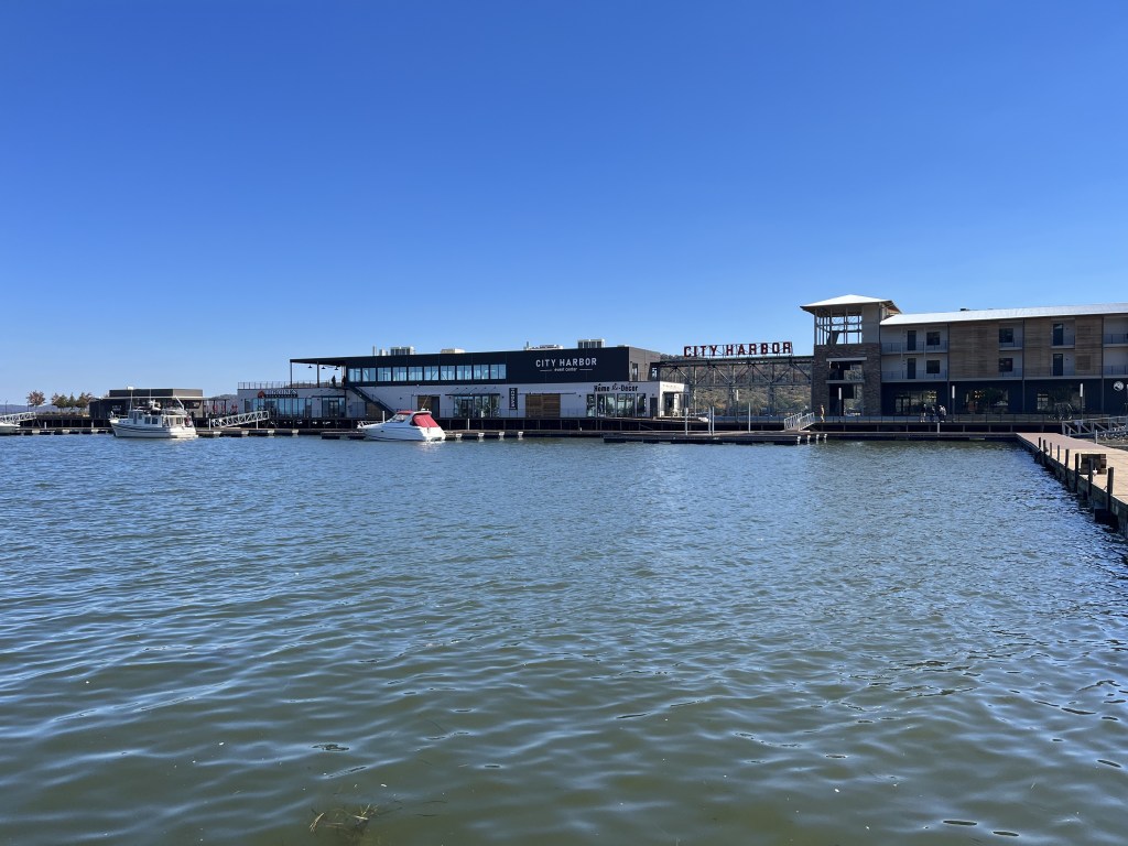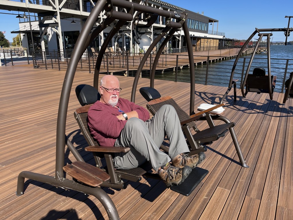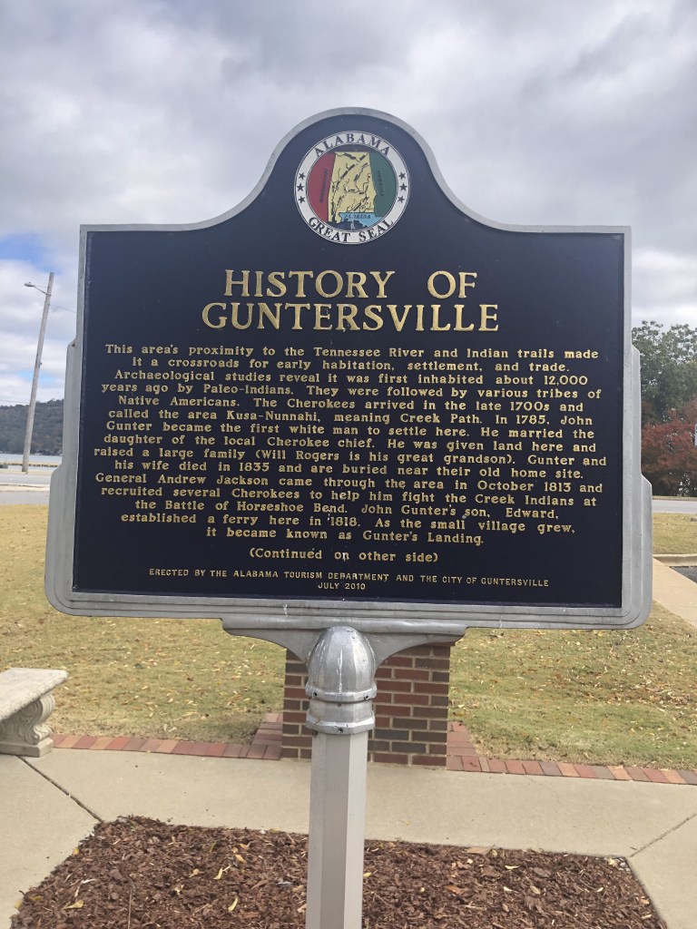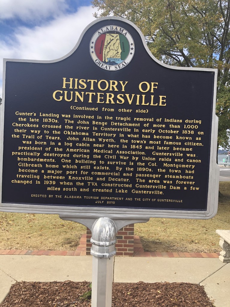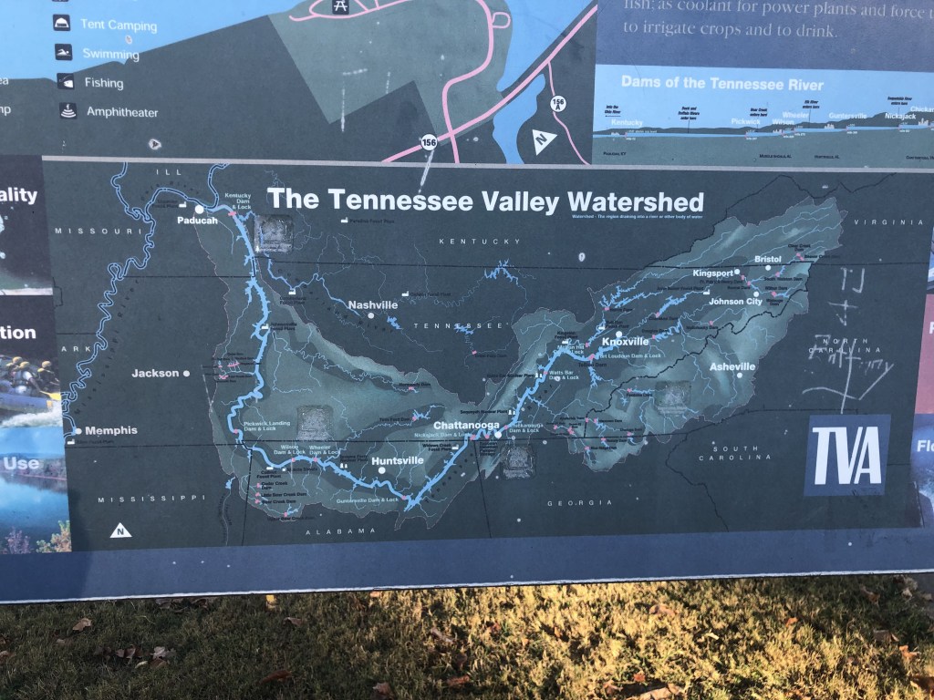 From Ditto Landing (Huntsville) we motored up to Guntersville after locking thru Guntersville Lock & Dam (40 foot lift). Guntersville City Free dock was just a few miles from the Lock. The city of Guntersville has done a nice job improving the waterfront with floating docks and restaurants to lure in the boaters in the area. There was a construction team building more docks out into the lake as I’m sure during the summer months the docks are filled with boats coming for the restaurants and such. We stayed 2 nights free of charge (no electric or water). Tim found a great Barber to cut his hair which made him feel good. We walked thru the small town after his haircut. Because our dock was free we decided to splurge on dinner and eat at Big Mike’s Steakhouse. It was good, but not near as good as Longhorns steak. I was disappointed. The next day Tim walked to the hardware store for odds and ends of things he needed. For brunch we ate at Another Broken Egg restaurant. I recommend this establishment–good food. In the afternoon we walked along the river and enjoyed the river from land. Along this walkway, the city had planted different kinds of trees…oak varieties, weeping willows, dogwood, maple, magnolia… We tried to guess the tree type before we looked at the plaque. Apparently we need to brush up on our tree varieties. Again, this was a very nice place to stop, especially since the docks can be used free of charge. Free is good!! Guntersville lake is the southern most part of the Tennessee River. From here we travel north thru Chattanooga, eventually to Knoxville.