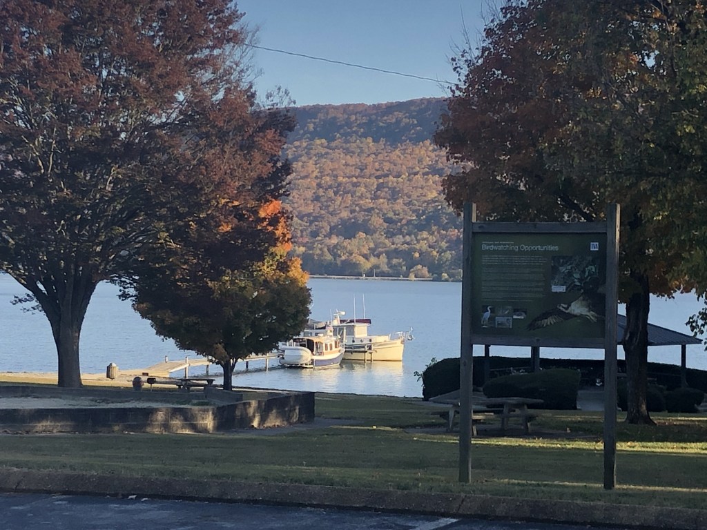 Shellmound Park: 65 miles to go today. We left Guntersville at sunrise because of the long travel day ahead of us. The hours seemed to go very quickly and the next lock, Nickajack Lock (40 foot lift) was open for us when we arrived at the lock. Our destination, Shellmound Park, was just about 15 minutes from the Lock. Again a free dock–yeah!!! There was another looper boat at the dock who helped us tie-up for the night. There were many campers in this park, but the area we were in was very quiet. We enjoyed a walk around the campground and seeing all the Halloween decorations. The night was chilly, but the moon was out and it was beautiful. I think I should have brought warmer clothes on this trip.