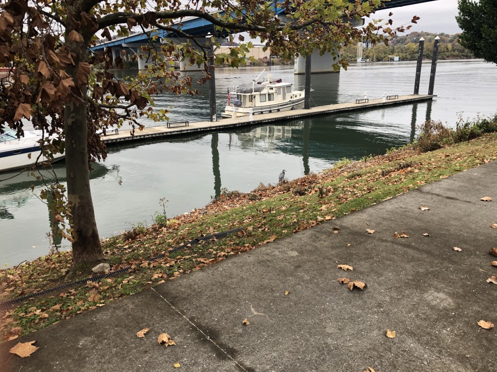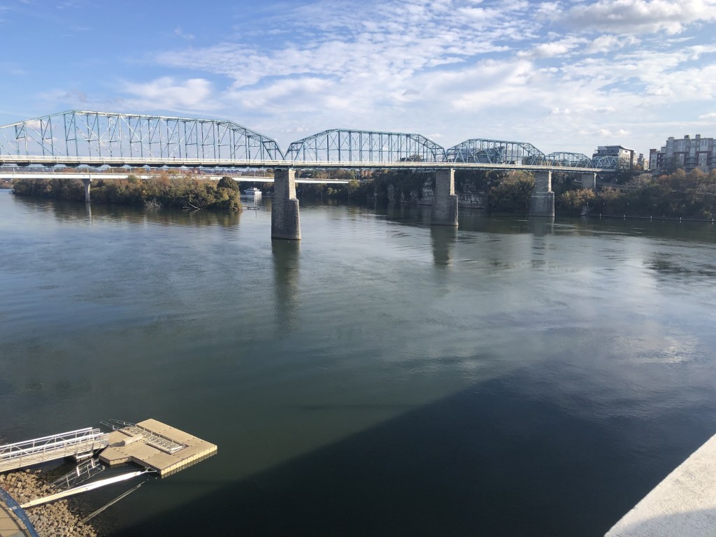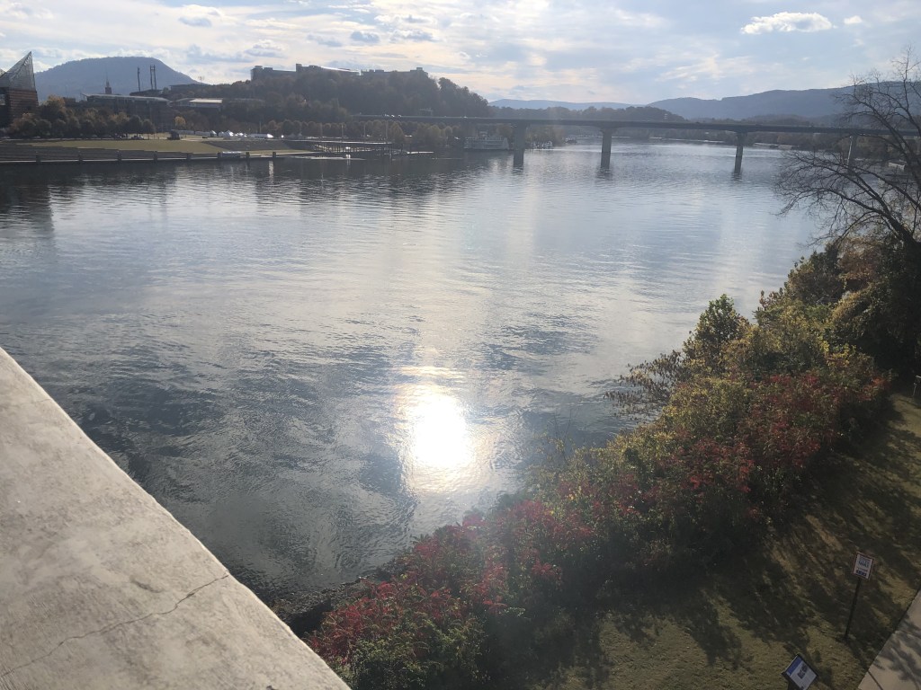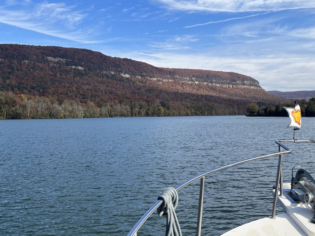 Chattanooga: Today was the day we would arrive in Chattanooga. When we woke up fog blanketed the river. After our last travel in the fog we decided to wait until the fog cleared. After about an hour, we headed up river. The Fall colors were so rich in color, but the pictures just don’t show how beautiful it was. As we entered Chattanooga it felt exciting. I’m not sure why except that going at 8 mph for 400+ miles, I may have felt we would never get here. Another reason could be that we had met some looper friends earlier and they were in this town (having finished their loop 3 weeks earlier).