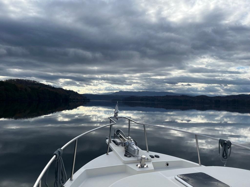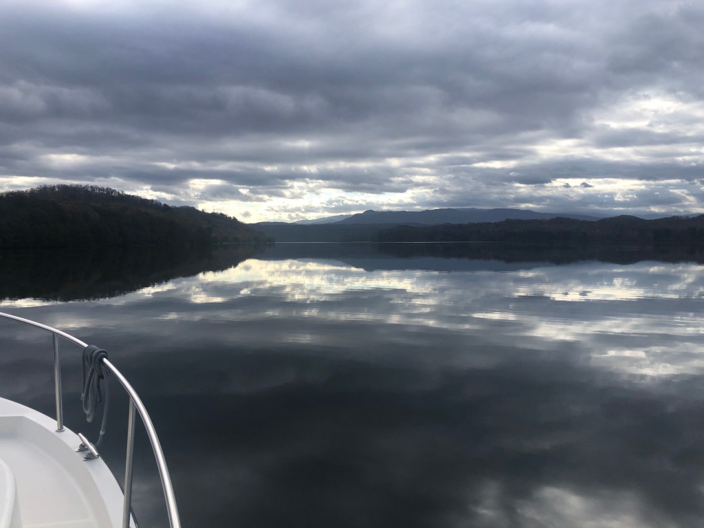 Our next adventure was to go 30 miles up the Little Tennessee River near the headwaters in the Great Smokey Mountains. As we left the marina, we were greeted with lots of wind (19mph gusting to 33) and very choppy water. We eventually stopped in a marina for the night because of the weather. The next day we motored another 18+ miles up the river and enjoyed the beautiful scenery. We stopped at the last navigation marker just a few miles from the North Carolina border and Tail of the Dragon road*, and then we motored downstream back to Fort Loudon Marina for the night.