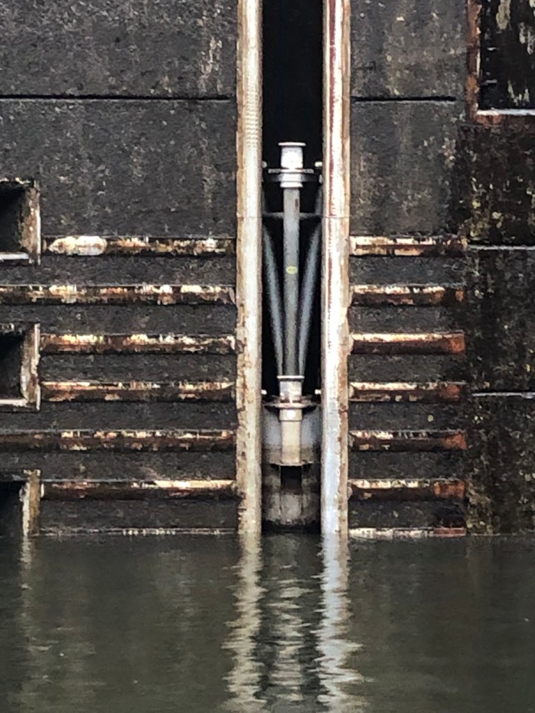 Columbus to Heflin Lock Anchorage – 69 miles and 3 Locks. Stennis (27′), Bevil (27′), Heflin (37′)–Another looper boat arrived in Columbus Marina our second night, so now we have 3 loopers traveling together. The lock masters want us to travel as a “pod” or whatever we might be called so as to make better use of the resources of the lock and water. We headed out at 6:30 to the first lock which was just downriver from the marina. FYI: Apparently when these locks were built, the government encouraged marinas to be built just above the locks…. So again we have 3 locks and again we locked thru very efficiently time wise. At the end of the day was an anchorage–oh no!!! This anchorage was in an oxbow….the dam was on the oxbow and the lock was actually on the waterway. So the area we anchored in was below the dam just before the water joined the river again. A good current and plenty of depth made me more comfortable with the anchoring thing. The moon was full so the whole anchorage was beautiful in the moonlight. We are still having some issues with the anchor chain/bridle making noise in our stateroom so I didn’t sleep well, but hopefully we’ll figure it out soon.