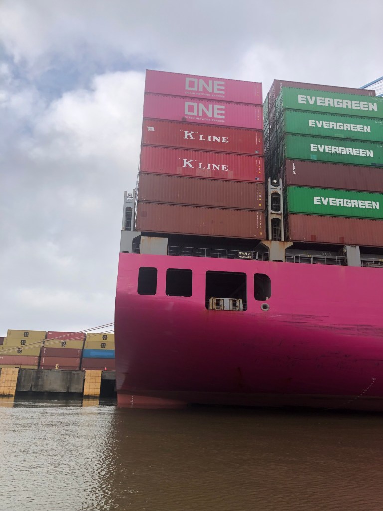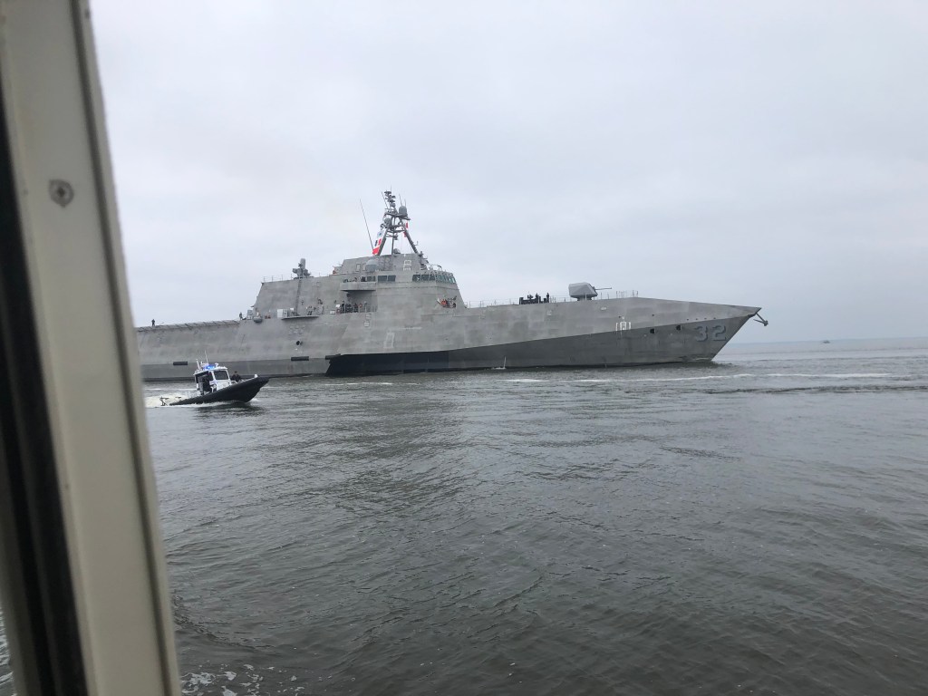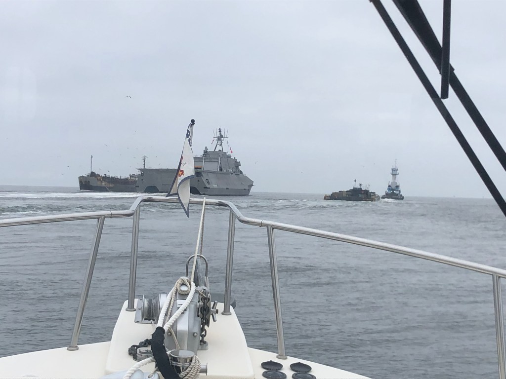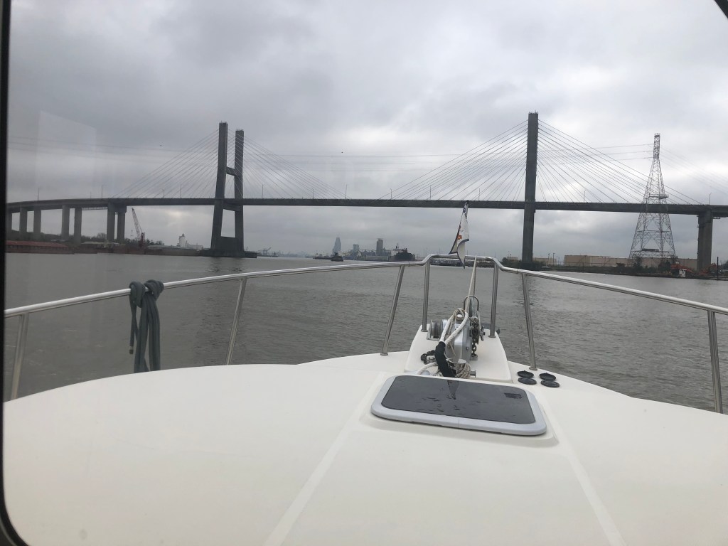 Tensaw to Mobile to Gulf Shores. 79 miles and 1 Major Shipping Port–Started early today as we had many miles to go to reach our intended marina. It was really strange to enter civilization after being so isolated on the rivers. Mobile is a very busy port and has become busier due to the issues in the west coasts ports. There were freighters, tugs and barges everywhere. One of the highlights was the navy ships apparently under construction. It was announced that one of the navy boats were preparing to leave the harbor and had a police escort. This navy boat (as pictured) made a “slow” pass on our port. I was glad it was a slow pass because the wake was still very big. It was crazy to see a navy boat in action and so close to our little boat. I do have to say, I’m not impressed by the strange look of the navy ship…but if it protects our country…..