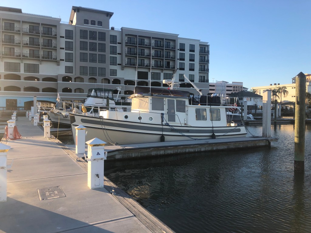 Gulfport–One thing I am learning about Florida are the tides–not something we deal with in the Great Lakes. I guess when you live here, the tides are just something you know and deal with everyday. Just make sure you a going out on the rising tide…. The area near our marina is shallow, so we left on the rising tide and entered the ICW. As I’ve stated before, each section of the loop has its own challenges. This area of the ICW has houses on either side with lots of boats all around us. There are No Wake areas and resume normal speed areas and lots of day marks to mark different areas of the bay or otherwise. Keeps you on your toes that’s for sure. We arrived at Gulfport Marina in a timely fashion and without much stress as Tim knew this area from his racing days at the Gulfport Yacht Club (right next door to the marina we are in).