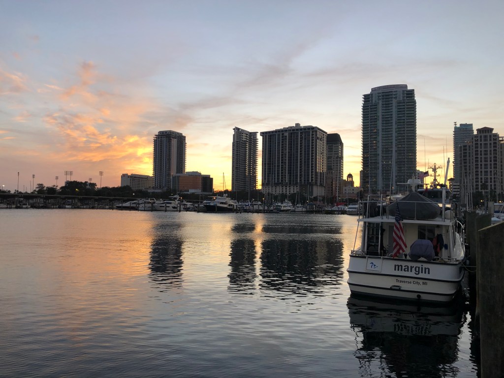 Thursday – Lumpy ride to St Pete Municipal–So Thursday we finally left Mr. Joe’s house and free dock on the rising tide. We were both a little nervous about traversing the canal and the “skinny” channel that lead to the main (well marked) channel. But as you can see we made it. (even Tim said he was really stressed). The water was really choppy, but our boat handled it well. Before we docked for the evening, we got a much needed pump out. After getting tied up in our slip we wandered around the downtown area again and found some good food for supper. Early to bed.
