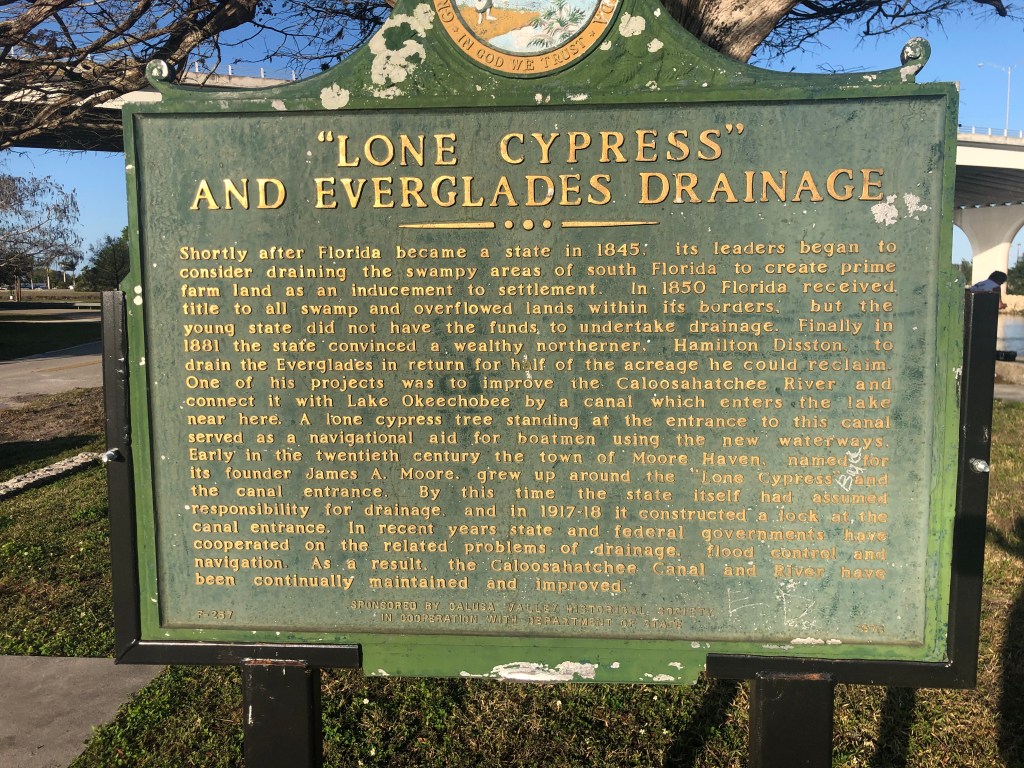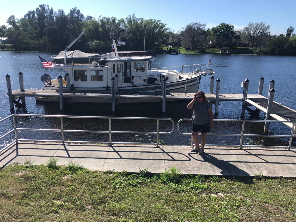 It is Monday morning and we are headed up the Caloosahachtee River (still learning to say and spell these Florida names). We are now in central Florida away from the big cities and people. The area around the canal is very rural. We were hoping to spend time in Labelle and see small town America, but the best laid plans don’t always come to fruition. The city docks we had hoped to use were under construction so that took that option away. We had planned to see Wade & Zelda on this stop too, so we improvised and meet them at a boat launch dock and took them for a 1/2 hour trip down the river on our boat. (I think they are hooked on cruising now). It was good to catch up with them. We then said good-by and headed to Moore Haven, another small town. While under way to Moore Haven we found out that Clewiston was also not an overnight option for Wednesday night as they were hosting a big fishing tournament. So we tied up in Moore Haven Marina (a dock on the river) for three nights instead. Moore Haven is a very small town and not much is happening. We did find a Mexican restaurant (carry-out only) and a pizza place not far from the marina (nothing is very far actually). Tim & I rode our bikes down the Main Street and then checked out the bridge over the River. We had a birds-eye view of the canal, dam/lock, and the area surrounding the bridge. It was interesting to see the many types of boats passing thru the area, either going east or west.