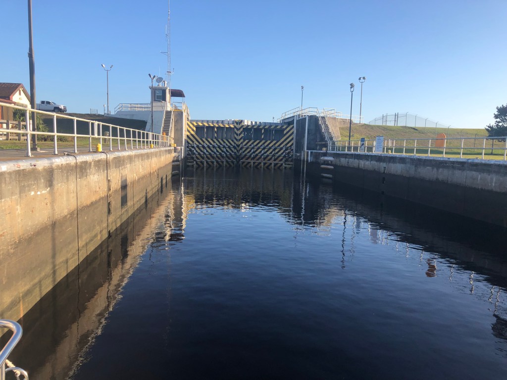 Thursday–was the day to cross Lake Okeechobee. With our hearts full of anticipation of new arrival in our family, we headed towards Clewiston and then into Lake Okeechobee. The waves were very lumpy and it felt like a long trip across the lake, but we arrived at Port Mayaca Lock without any issues. Lake Okeechobee is very shallow and can get very nasty at times.
