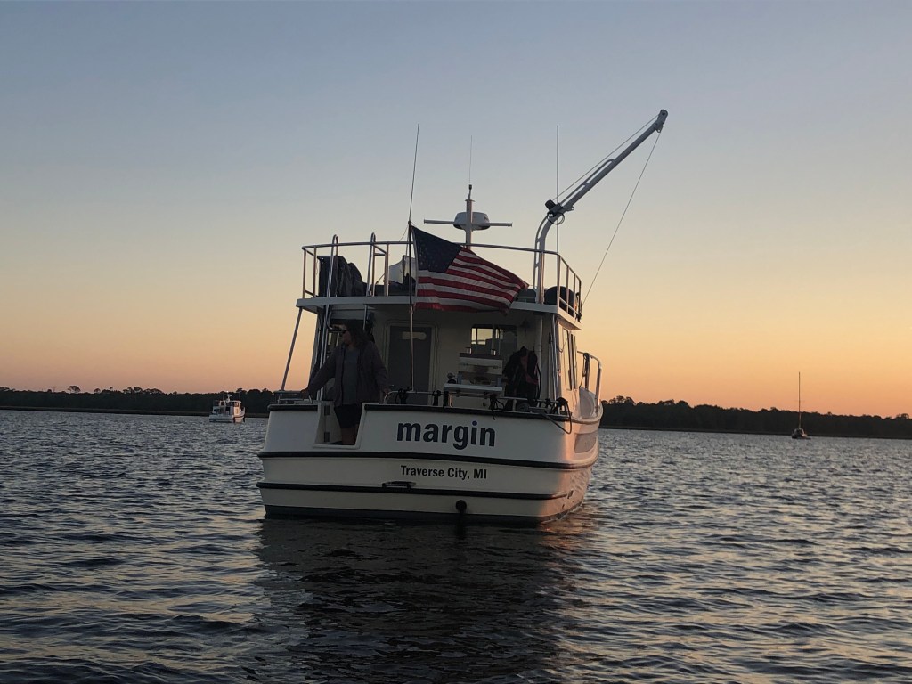 Next day travel to the Cumberland Island anchorage–We anchored with Nagui (Boundless) and Joe & Jenny (Blue Wanderer). We arrived in good time and enjoyed an afternoon anchored near Cumberland Island. Tim & I took the dinghy to the island and walked for about an hour….apparently the plantation ruins were on the south end of the island. Later that afternoon, Blue Wander arrived at our anchorage. Dinner invites were issued by Blue Wander where we convened for supper (the 3 boats). There were 5 people on the 32ft Nordic Tug. We were glad that Nagui could meet our friends.