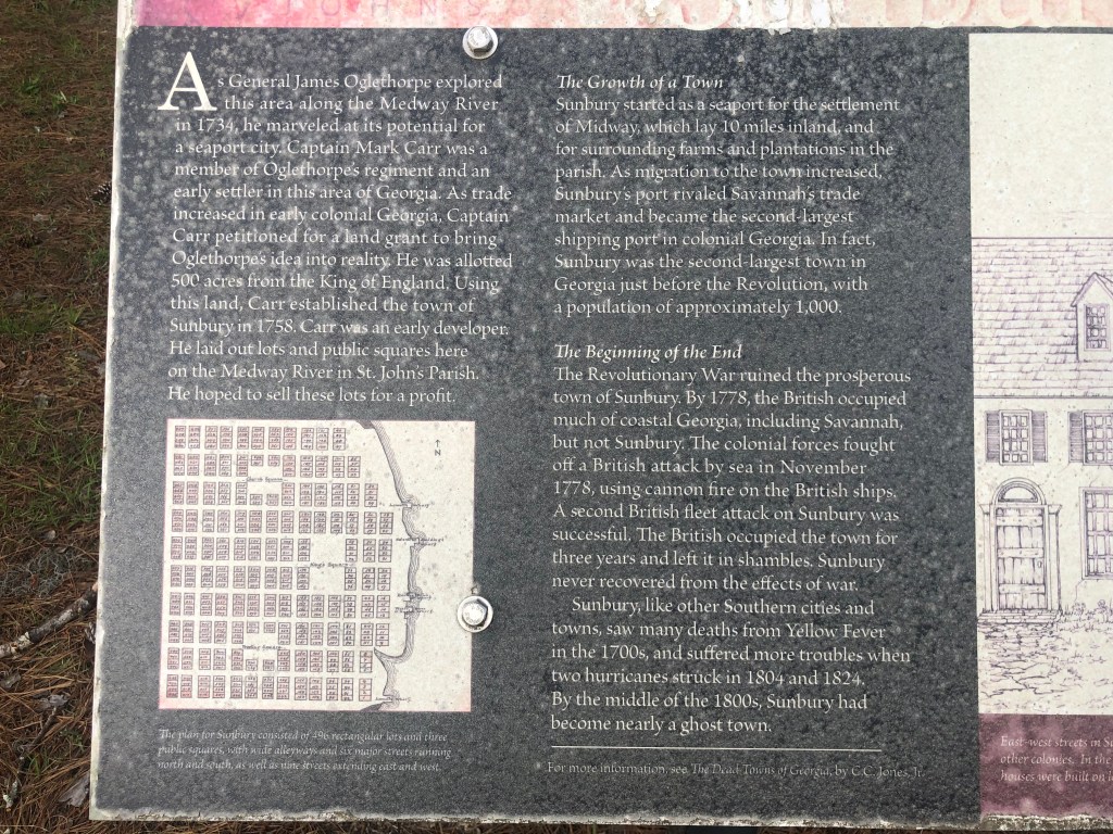 On to Sunbury–We arrived at Sunbury Crab Company after 7+ hrs of motoring. This involved motoring up a river for 5 miles to reach our destination. As you can see from the pictures, the walk to land took awhile. Sunbury has a naturally deep harbor and could have been a deep harbor port, but Savannah took that prize. But the town did have many things happen in the area during the revolutionary war.