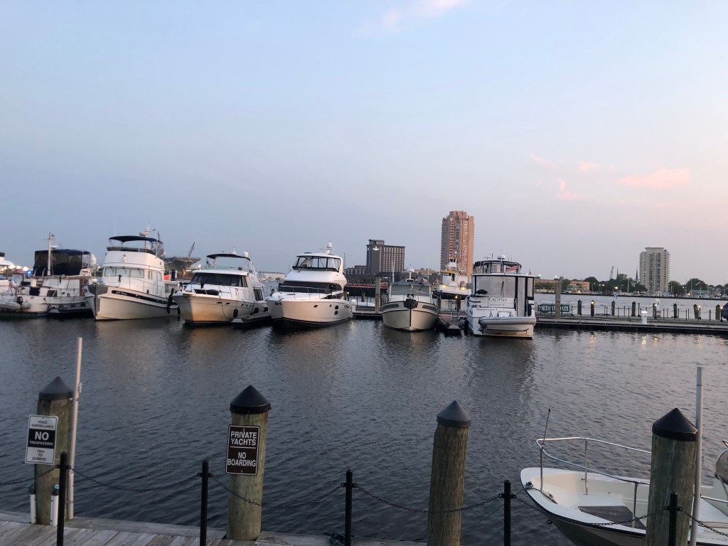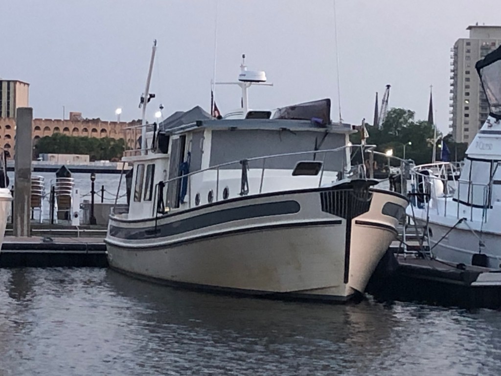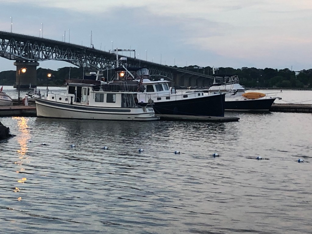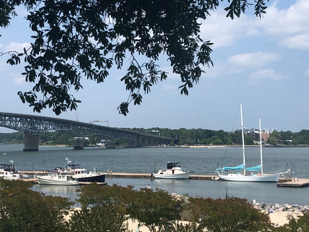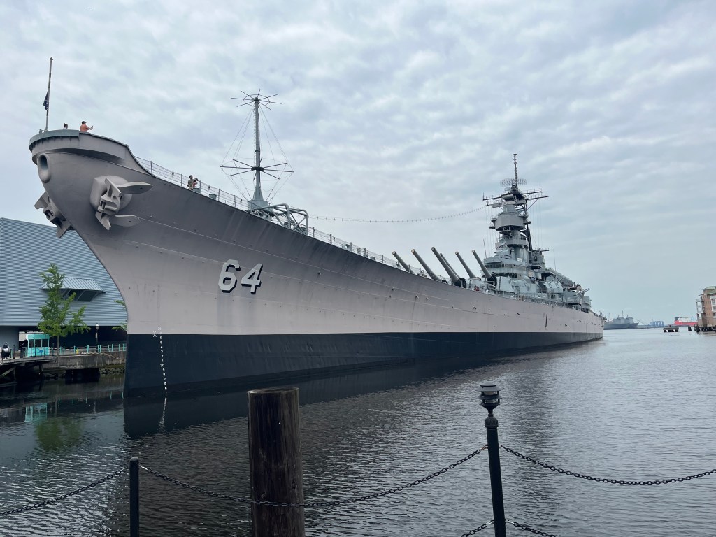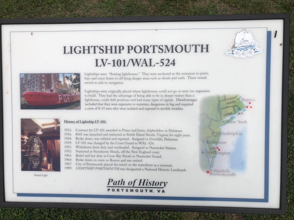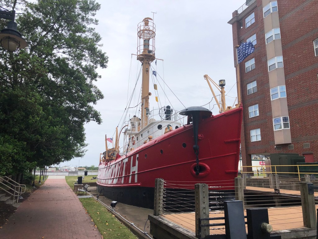 The next morning we headed to Waterside Marina in Norfolk. This was a short jaunt into Norfolk and we only had to wait for one railroad bridge to open. Waterside Marina is the place for the Spring Rendezvous for those planning, doing, or have done the loop. We’ve never attended at this site but it was fun to image what it would have been like by just being at that location. Upon our early arrival Tim meet up with 3 guys from another nordic tug at the marina. Tim joined them for a harbor boat tour and a tour of the battleship Wisconsin. I was left to my own devices for the day. I walked along the riverwalk around the battleship and many blocks of town. I also enjoyed window shopping the small shops in the area on my own. Dinner together was at the Blue Moon, one of the restaurant in the Waterside district.