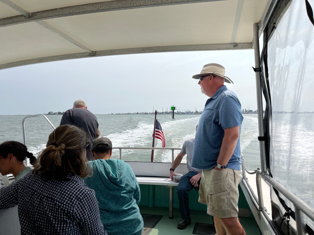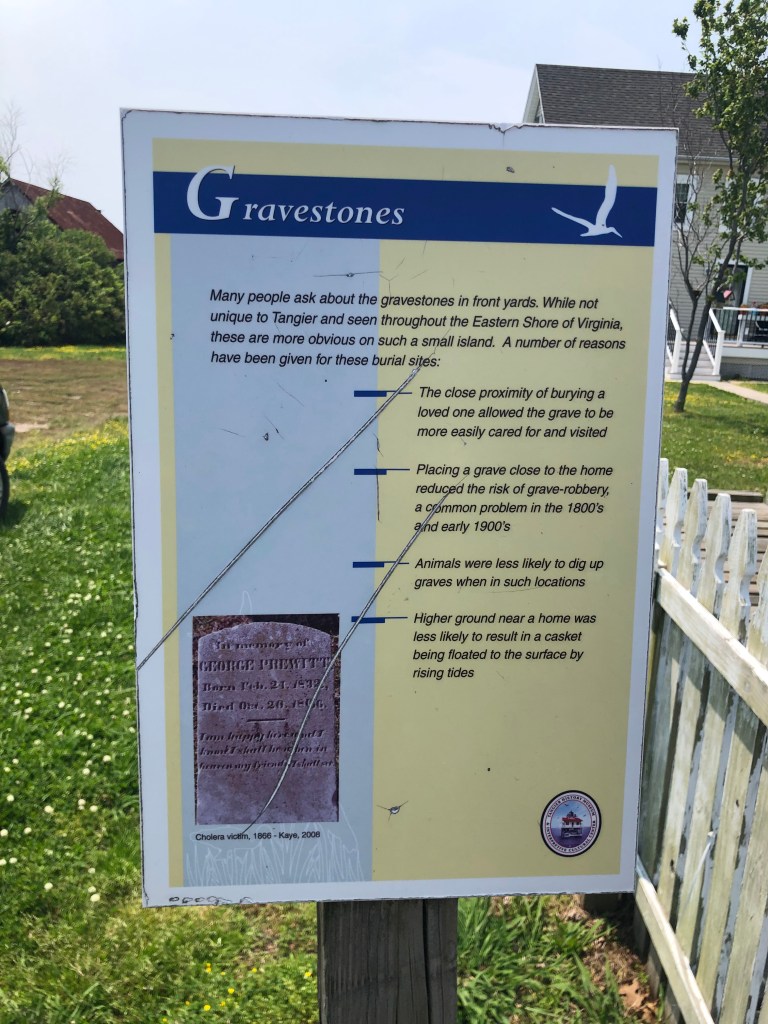 The next day we decided to take the ferry to Tangier Island. The winds made it a very bumpy and wet ride, but the captain was/is very experienced as he makes this trip many times a day. Tangier Island has a population of about 250+ people who live on this island year round. There are churches, a school, grocery store, post office, but very few cars–mostly golf carts as the street are very narrow. Most of the men are watermen who make a living from the surrounding waters. There are real concerns that this island is getting washed away and may not be there for the next generations. Such an interesting community isolated for the most part from the hurried life most American live. We did have lunch on the island and I tried crab cakes—not bad tasting especially since it was very fresh and probably caught by one of the local watermen.