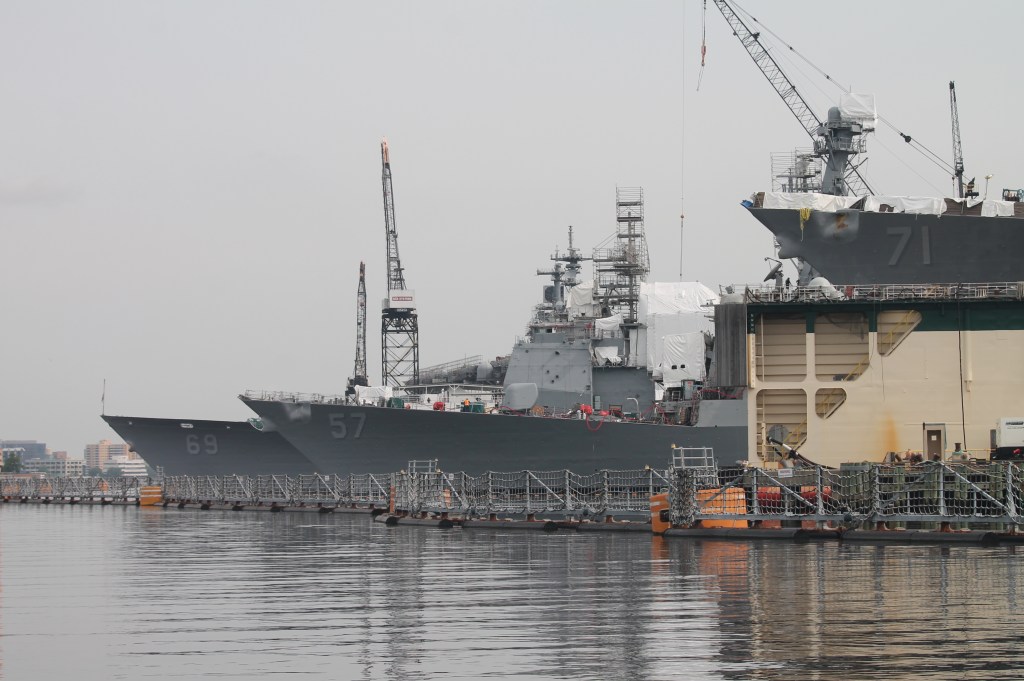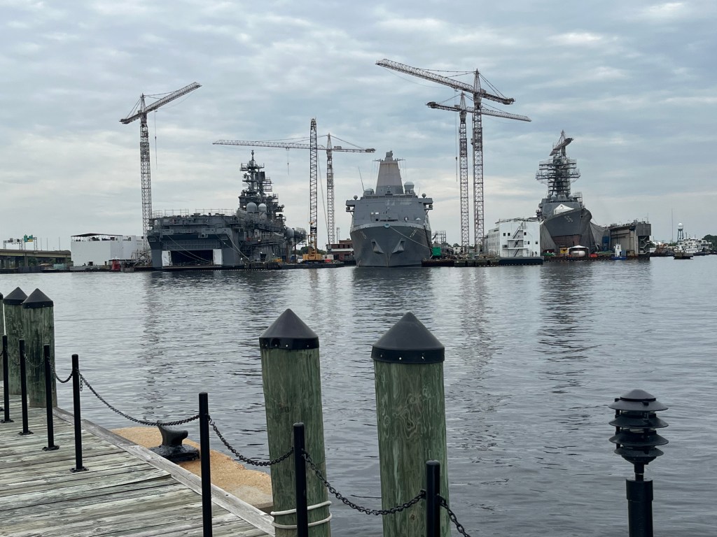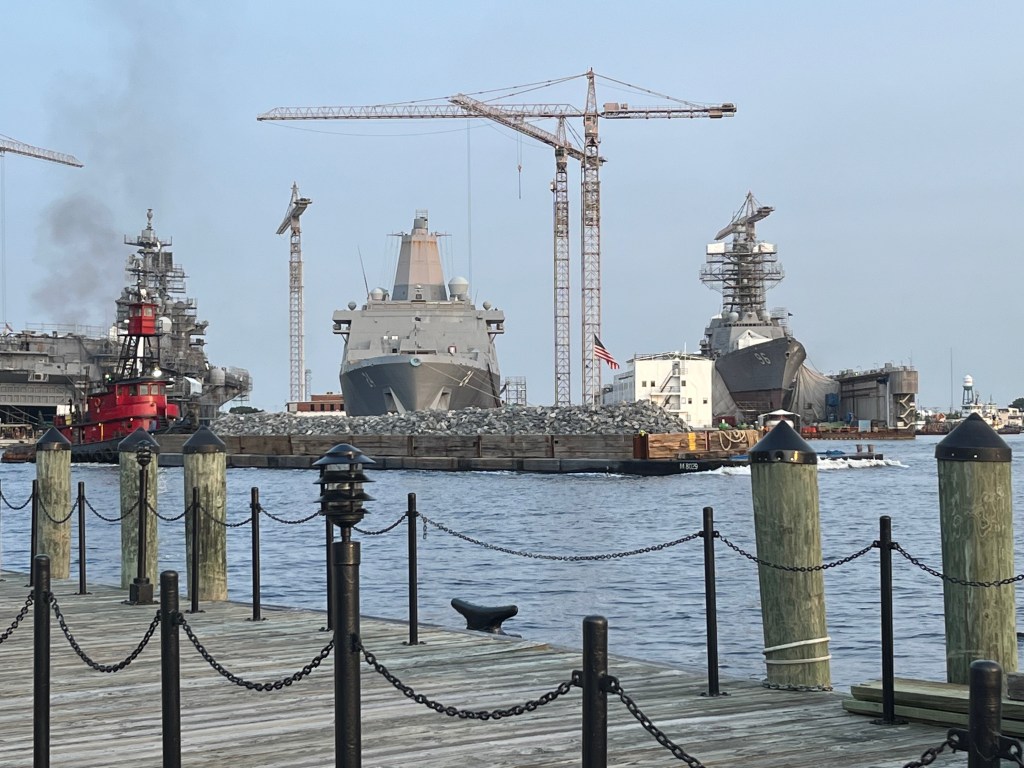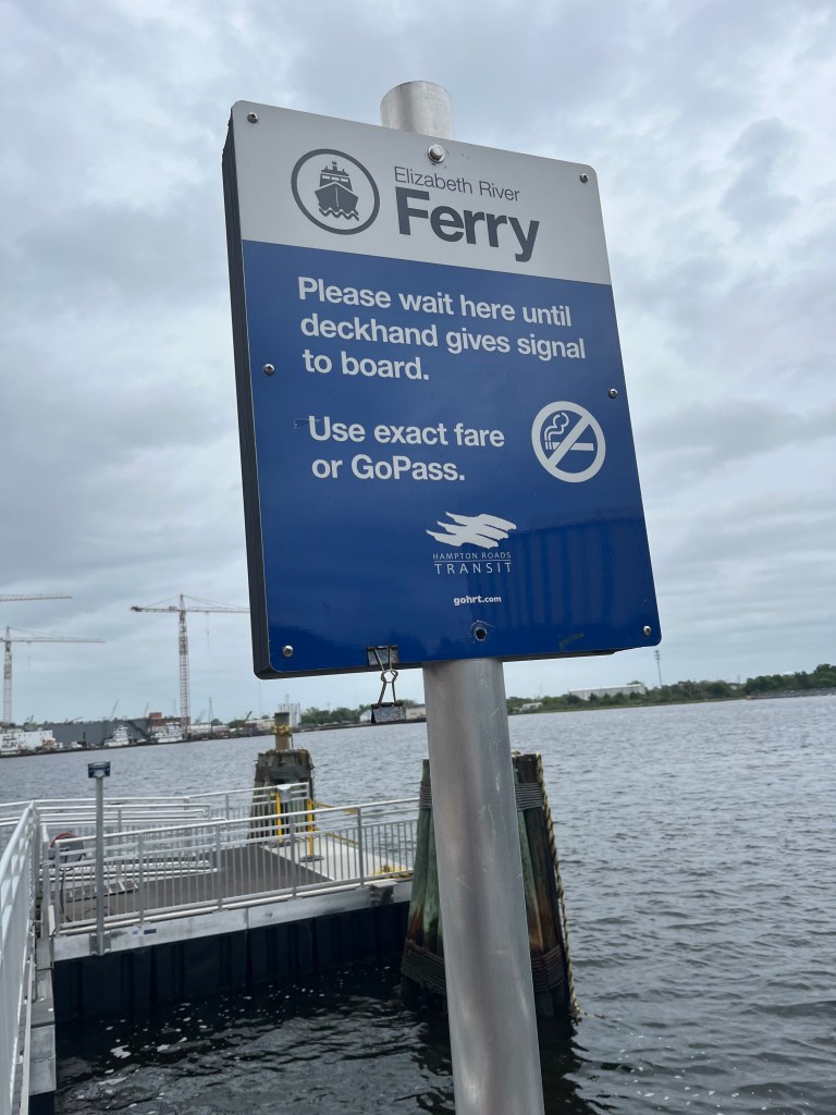 Day 5 in Norfolk-Time to explore Portsmouth. We again walked on the riverwalk and explored the waterfront of Portsmouth. The Navy ships were everywhere, mostly getting retrofitted and modernized. We toured the Portsmouth Naval Shipyard Museum. Lunch was at a local restaurant two blocks from our marina and it was very good. Our walk back to the marina went thru a couple historic streets. One thing that really struck us was all the red bricks used on the sidewalk. We have seen these bricks everywhere which makes each place have a certain appeal to me. We finished up our day with a round trip on the ferry that goes between Norfolk and Portsmouth. Time to relax and enjoy. Now it was time to get ready for moving north tomorrow as there is a good weather window.