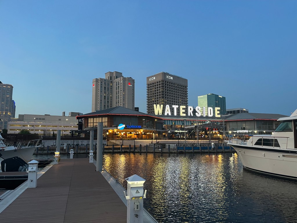 Day 2 in Norfolk Tim went for a long walk as well as mailed a present to his Mom from the post office. While Tim was doing his errands, I joined another Canadian couple and provisioned at the local grocery store. Once we were both back at the boat it was time for boat chores–washing the outside, cleaning the inside, defrosting the fridge and putting the groceries away. Sounds like fun, aye. After all that fun we enjoyed a walk south on the riverwalk towards the baseball stadium.