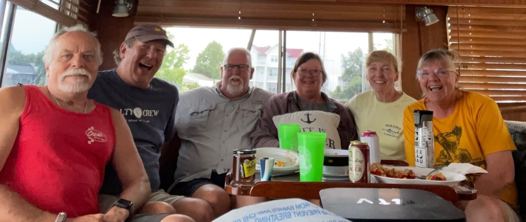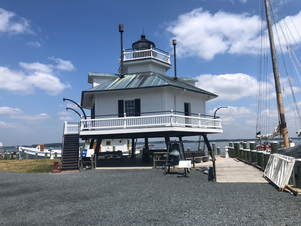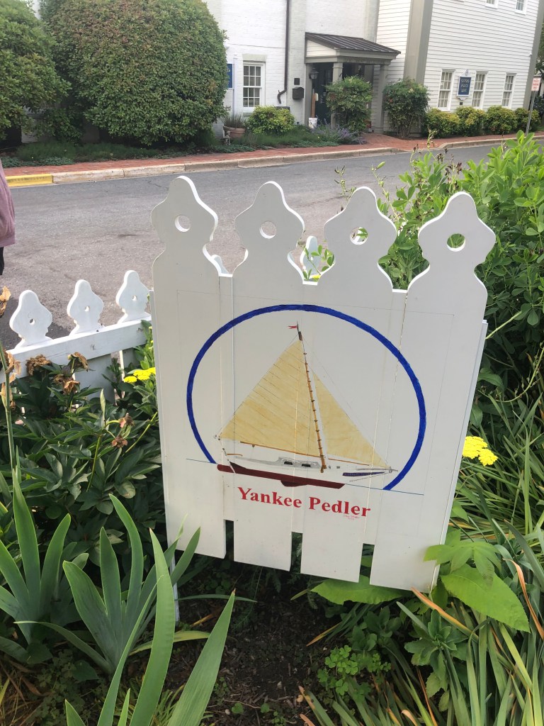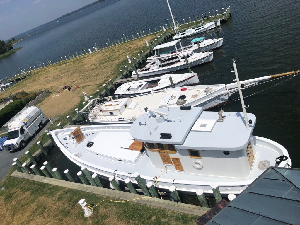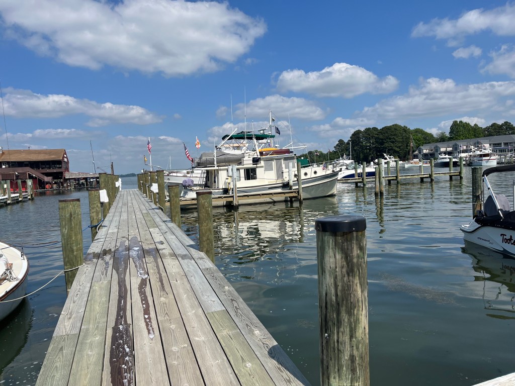 St Michaels — We left Oxford a little later than usual as fog blanketed the area. We could see across the harbor so decided to poke our nose out into the bay. It was a no-go situation so we returned to the Safe Harbor fuel dock for an hour until the fog cleared. Tim did a great job backing into our slip in St. Michaels. We only stayed for one night so we conquered/divided the afternoon activities. Tim visited the Maritime Museum and I walked the Main Street (about 6 blocks) getting my retail therapy (window shopping). Can’t buy much when you live on a boat. I did buy a slice of carrot cake for Tim from the Smithfield Island Cake Co. We enjoyed dinner in the company of the crew from Coconuts (Sara & Bill).