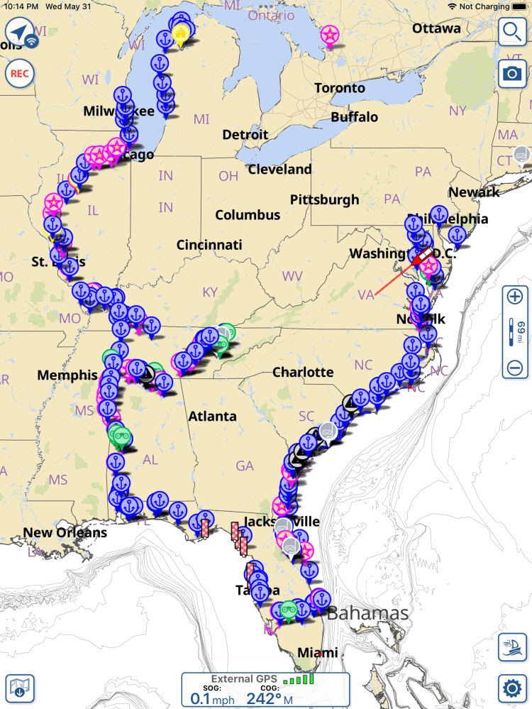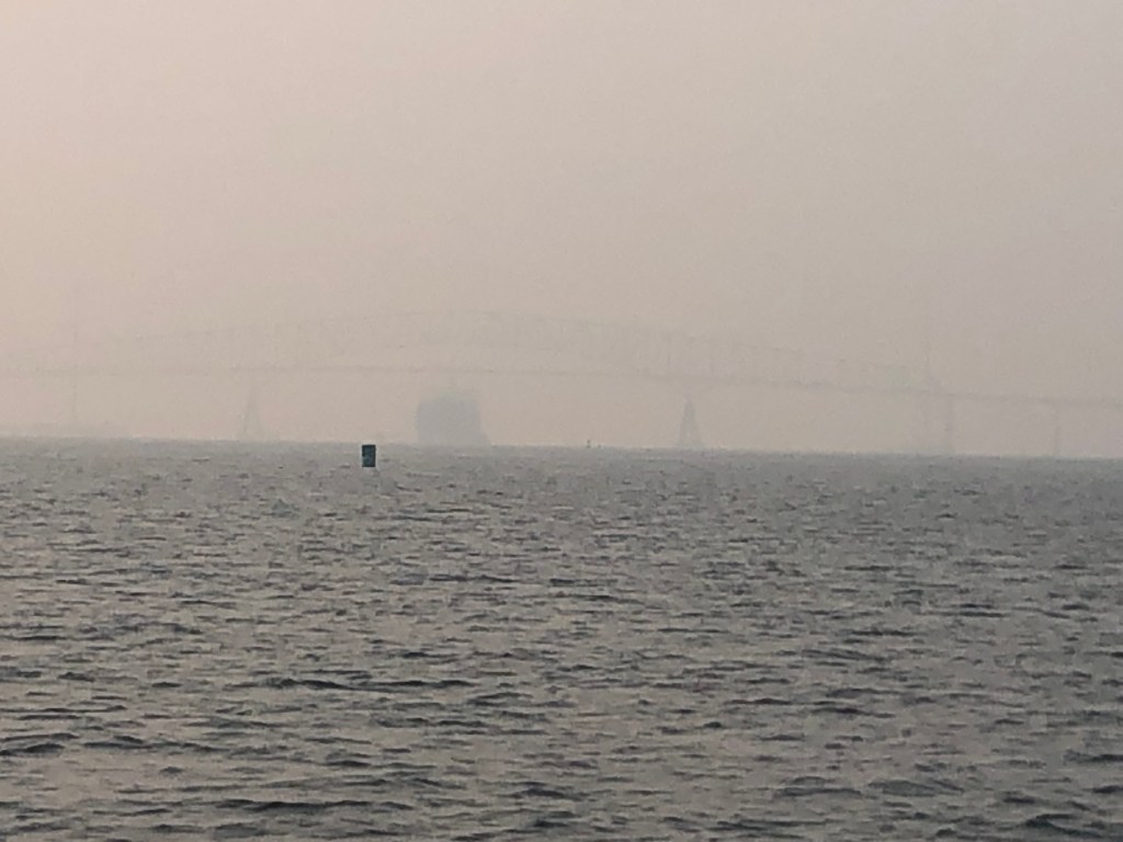 Notes of interest: The smoke from the Canadian fires can be seen in the bay. What could be a beautiful view of the bay is now shrouded in a haze and will likely get thicker as we meander north.