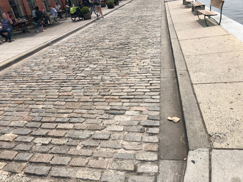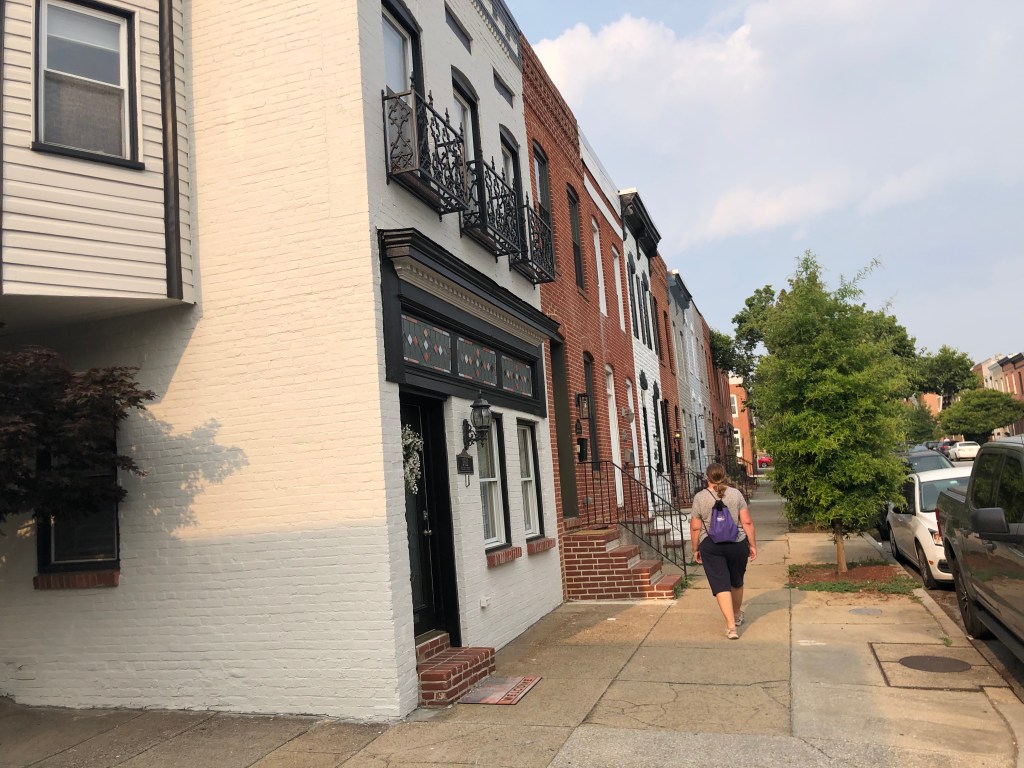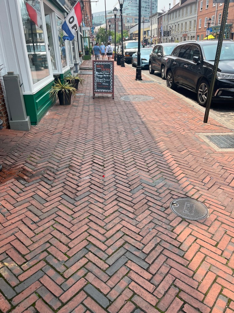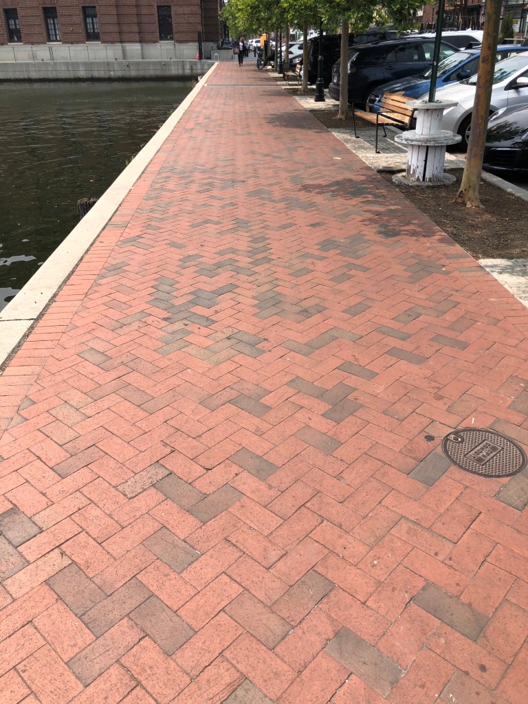 Before we met with Bob, Tim & I walked the harbor walk to Fells Point. It was very hot, but interesting to see the older section of town and lots of red brick again. Many of the street were cobblestone which caused me to wonder how women traverse those street in heels (I almost twisted my ankle when I wasn’t paying attention). The part of the harbor where we docked was lined with apartment buildings and townhouses (row).