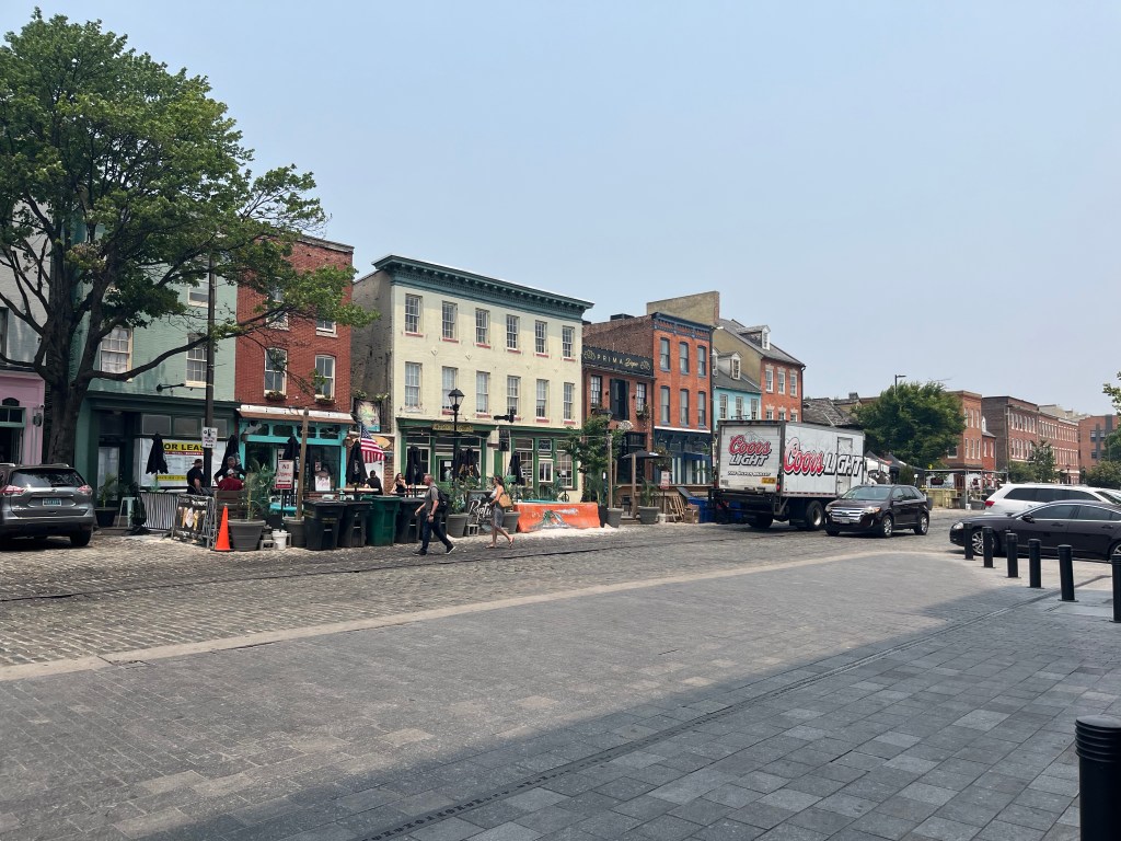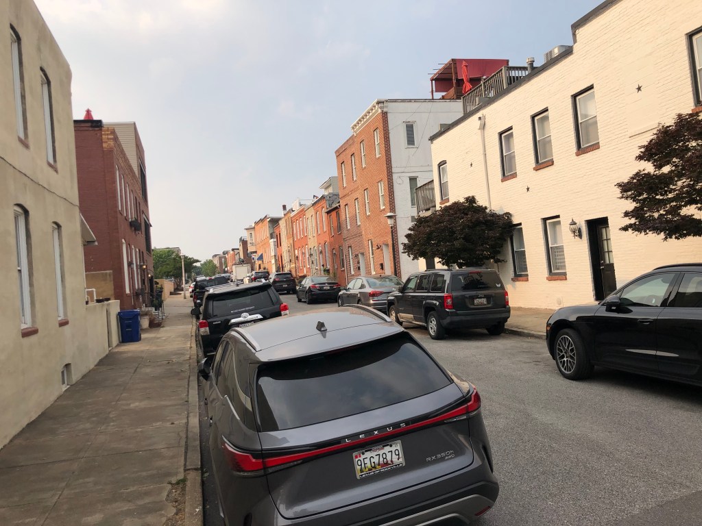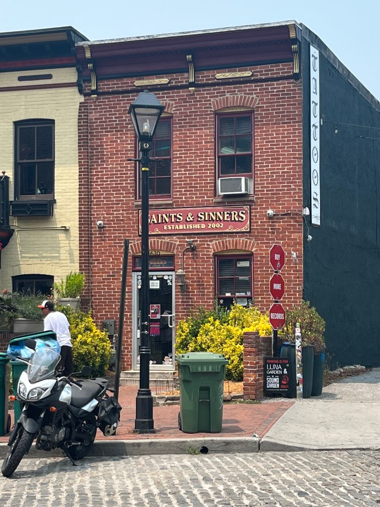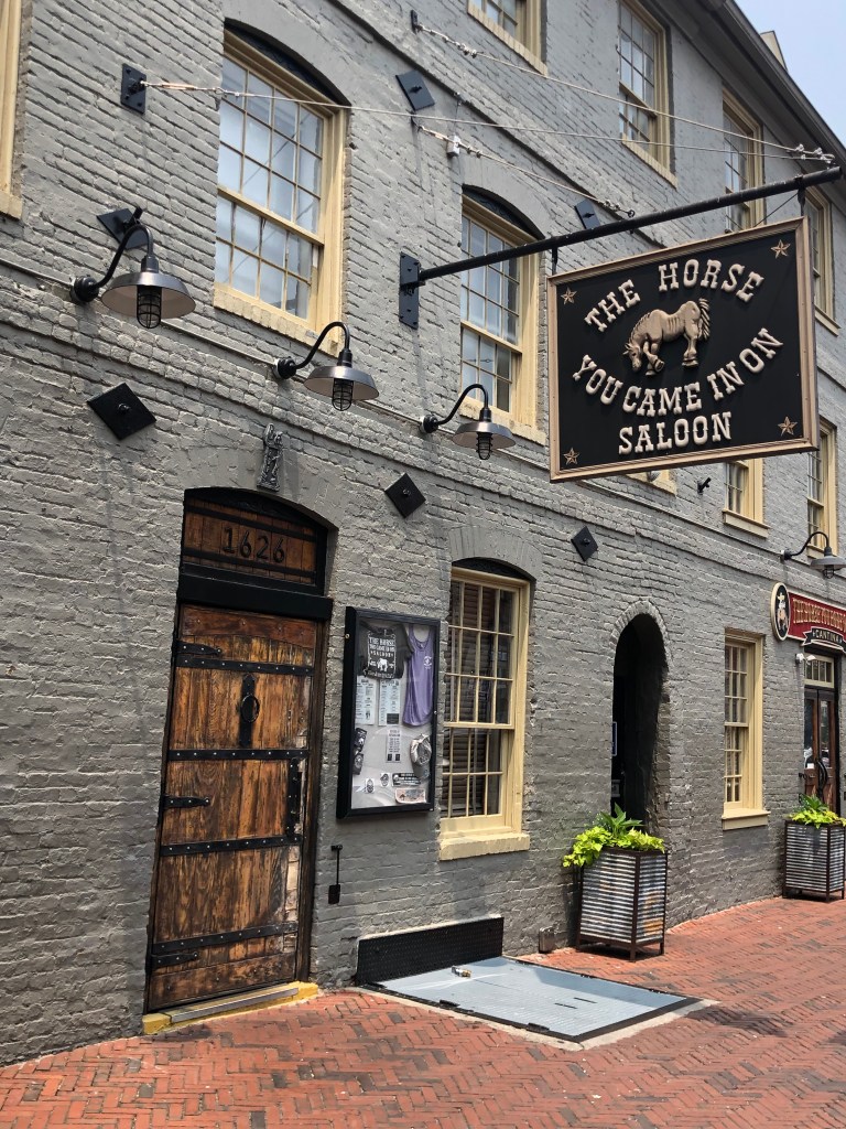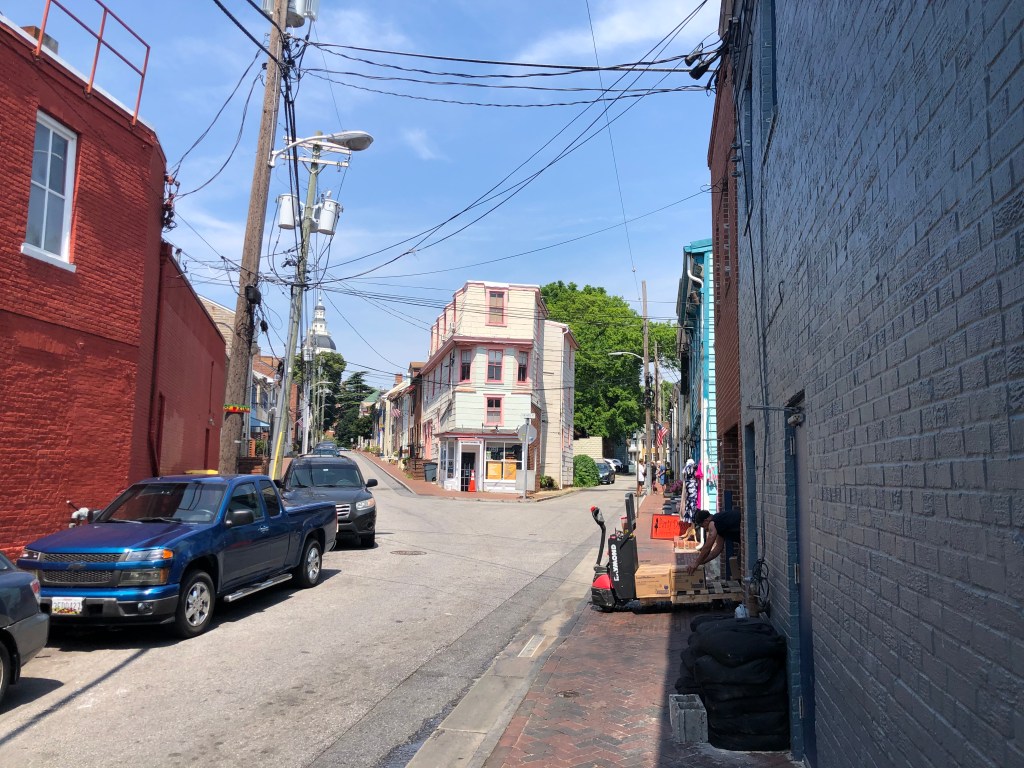 Before we met with Bob, Tim & I walked the harbor walk to Fells Point. It was very hot, but interesting to see the older section of town and lots of red brick again. Many of the street were cobblestone which caused me to wonder how women traverse those street in heels (I almost twisted my ankle when I wasn’t paying attention). The part of the harbor where we docked was lined with apartment buildings and townhouses (row).