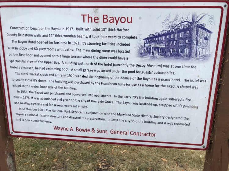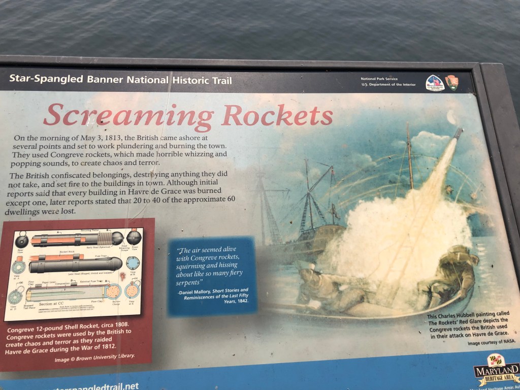 Havre de Grace — Fun Fact: Havre de Grace almost became our nations capital. The tie-breaker voted Washington….and so Havre de Grace became a river city. Another sleepy town with a few more stores/restaurants than other sleepy towns in this area. We enjoyed dinner at a restaurant overlooking the river (we enjoy eating at local places). We did a walking tour of some of the old buildings in the area as well as walked through the Duck Decoy Museum in town. We learned more about the history of the town while walking on the boardwalk along the river. It amazes me that even though we fought the British while our country was young, our countries are now allies. Soon we will be leaving the state of Maryland when we cross into Delaware. In 25 days, we visited 12 cities all located on the Chesapeake Bay!