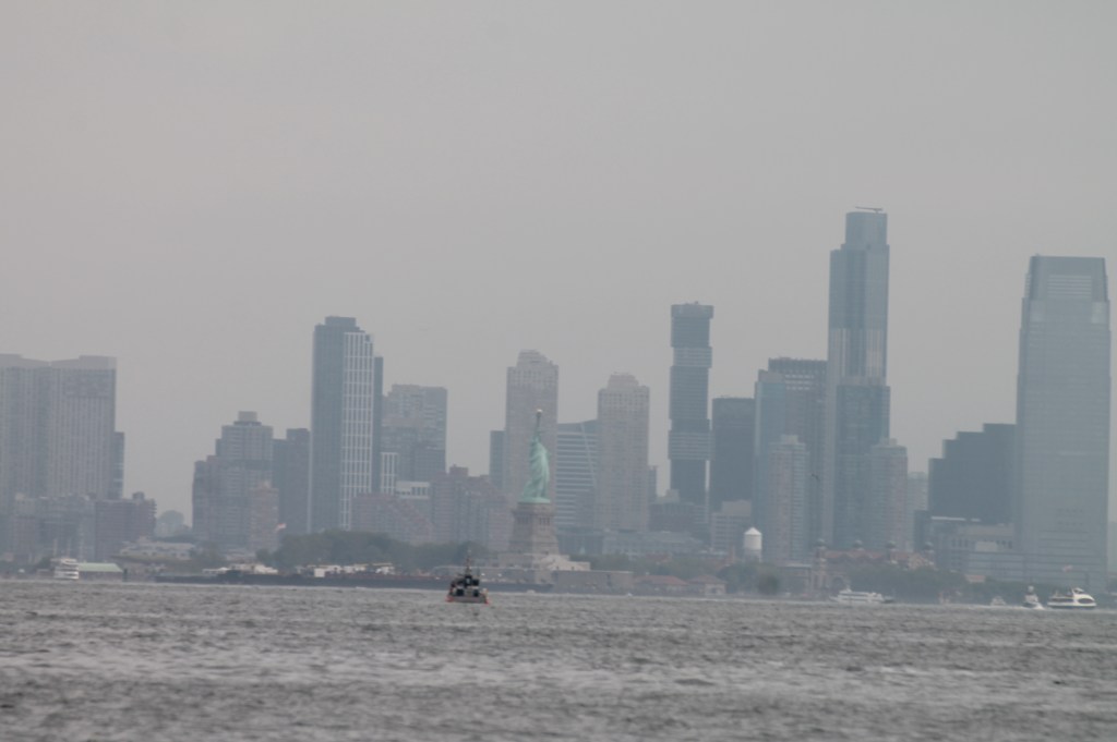 Monday was a day of rest with a walk into the town of Great Kills. Tuesday we headed to Hudson Point Marina in New Jersey, but directly across the Hudson River from Manhattan. The dividing line between NJ & NY is down the Hudson (mostly). It gets confusing not knowing what state you are really in (remembering what day it is is hard too). On our way to our marina, we passed Lady Liberty and had our buddy boat take the special picture of “Margin” in front the Statue of Liberty,.