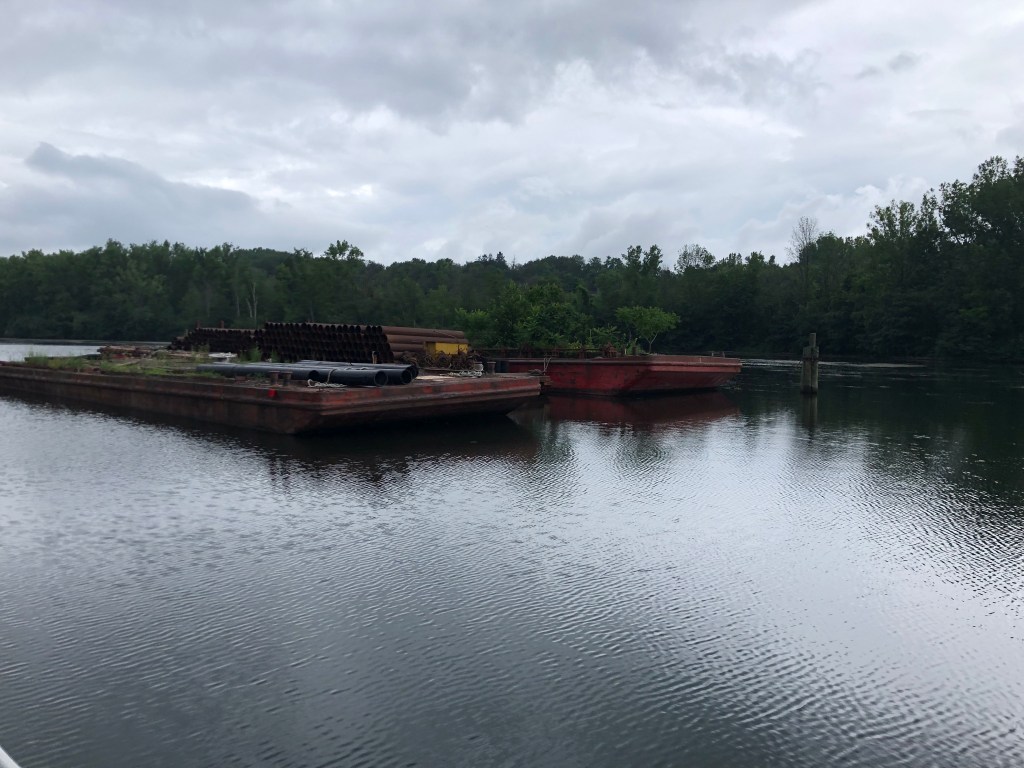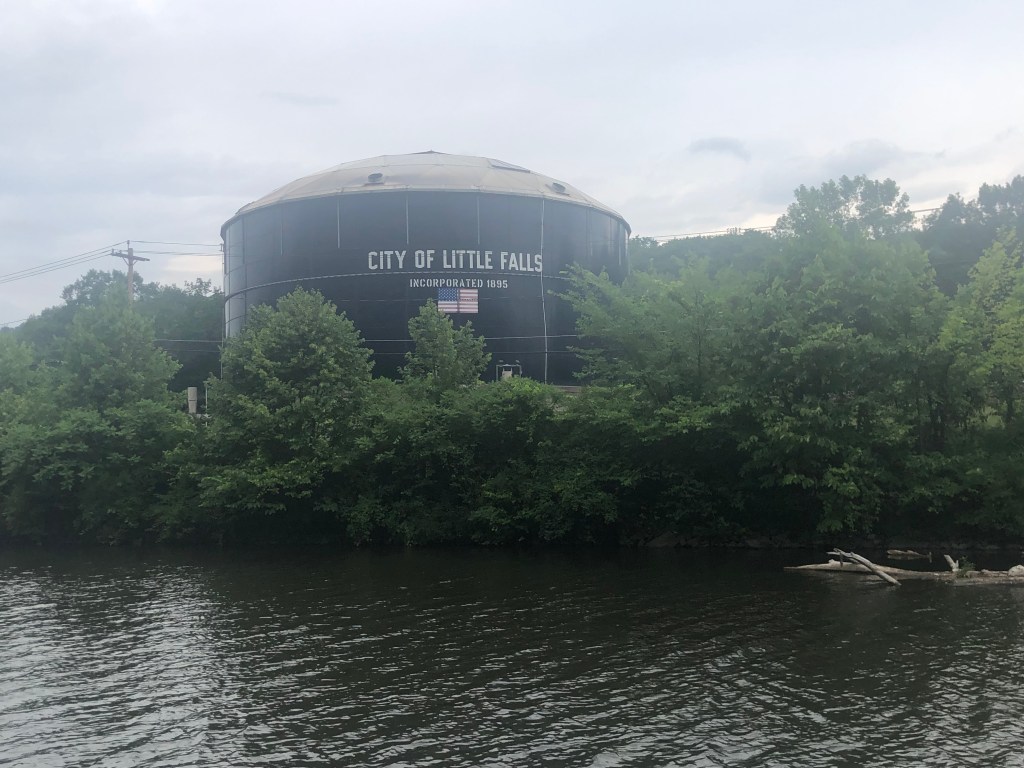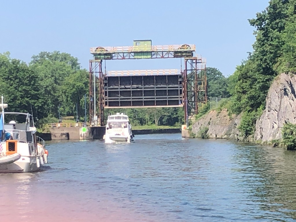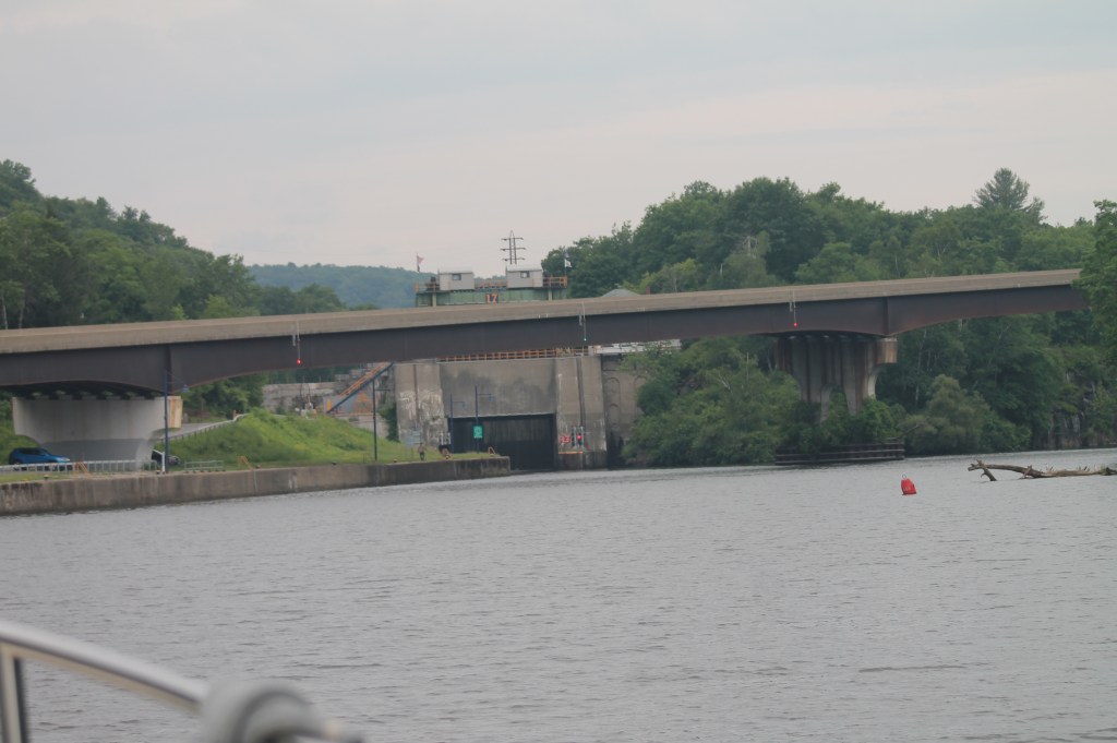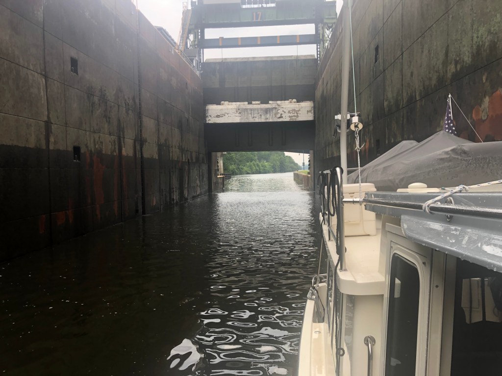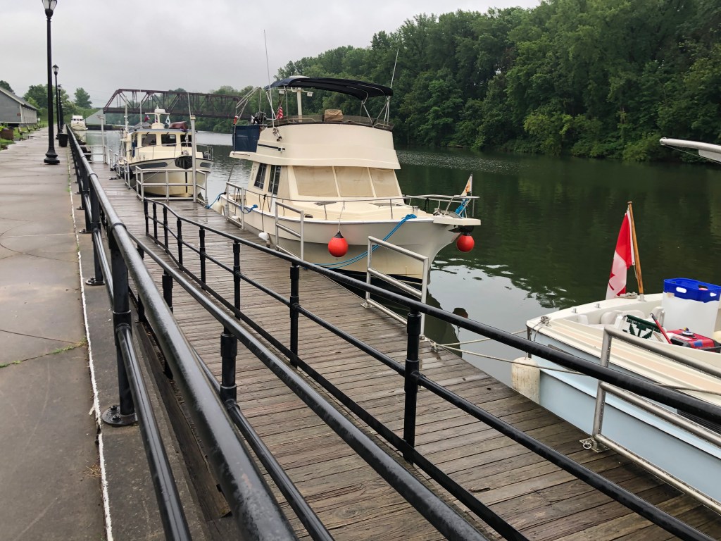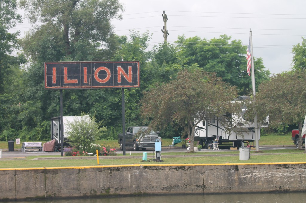Ilion: Locks 16-18. Left at 7am to travel in the cool of the morning. Uneventful day of travel. The one unusual lock was lock 18 just before the city of Little Falls. This lock didn’t have doors that opened/closed on hinges. But rather this unique lock lowered and raised guillotine type doors. It is unsettling to drive the boat under the doors to enter the chambers of the lock. We decided not to stay in Little Falls as we had visited there during our boat shopping days in and around Albany area. Anyway, we arrived in Ilion Marina where “Pony” and “Pickets Pub” were docked. Not much here, but we did find an Aldi’s to supplement our food on the boat. Enjoyed drinks (Diet Coke and Ice Tea) at the local McDonald’s. Another trip to Ace Hardware–always something to be fixed on a boat. A storm was predicted in the afternoon, but all we got was rain. Pump-out scheduled for first thing in the morning.