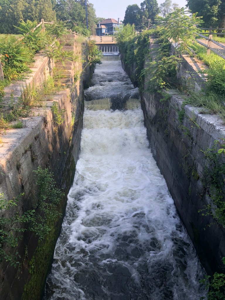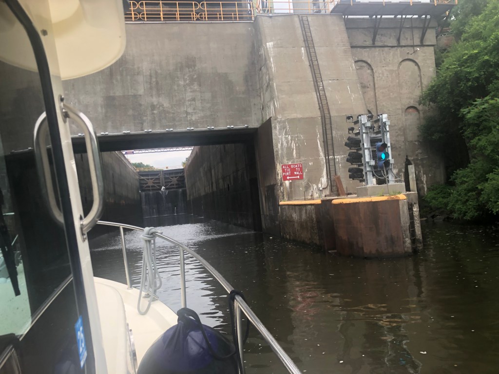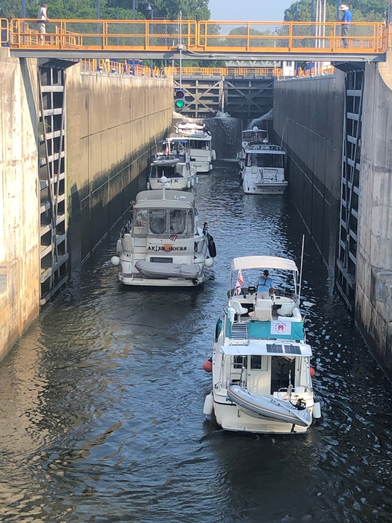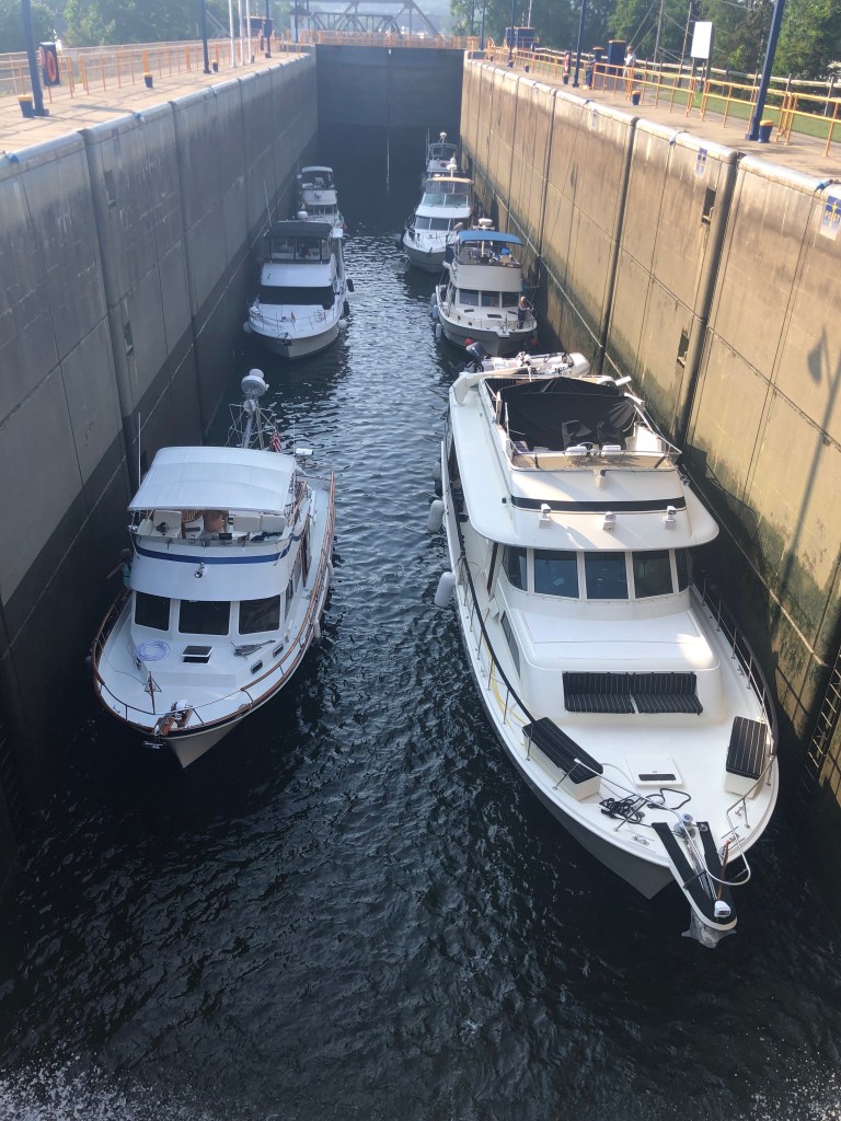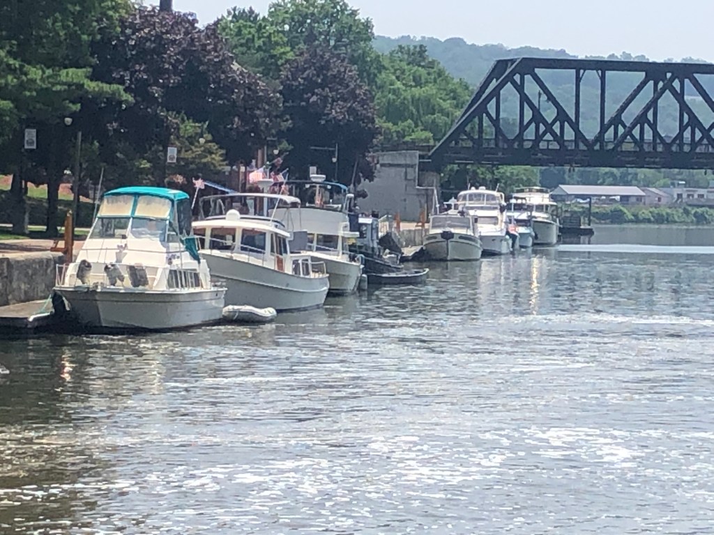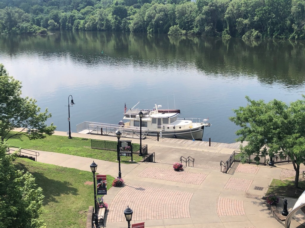 Waterford–flight of 5 locks: 13+ looper boats are headed west on the Erie Canal. We decided to wait for the second group vs rushing to get to Lock 2 at 8am with the 7 others boats. Flight of 5 locks + 1 lock with 5 other boats that very hot day. We cruised about 20nm and docked for the night at Donovan’s Mohawk Harbor in Schenectady (same owners as Donovan’s Shady Harbor). The harbor is shaped like a fish and is surrounded by apartment buildings on one side and a casino on the other. Tim & I enjoyed a walk around the area and even walked part of the Erie Canal trail thru this town. We had supper with looper friends (Oyster). My dinner was a gourmet grilled cheese sandwich with a side of greens…so yummy as I’ve been craving a cheese sandwich for days now. Not part of the diet, but so worth every bite. Of course the greens helped my guilty conscience. (sort of).