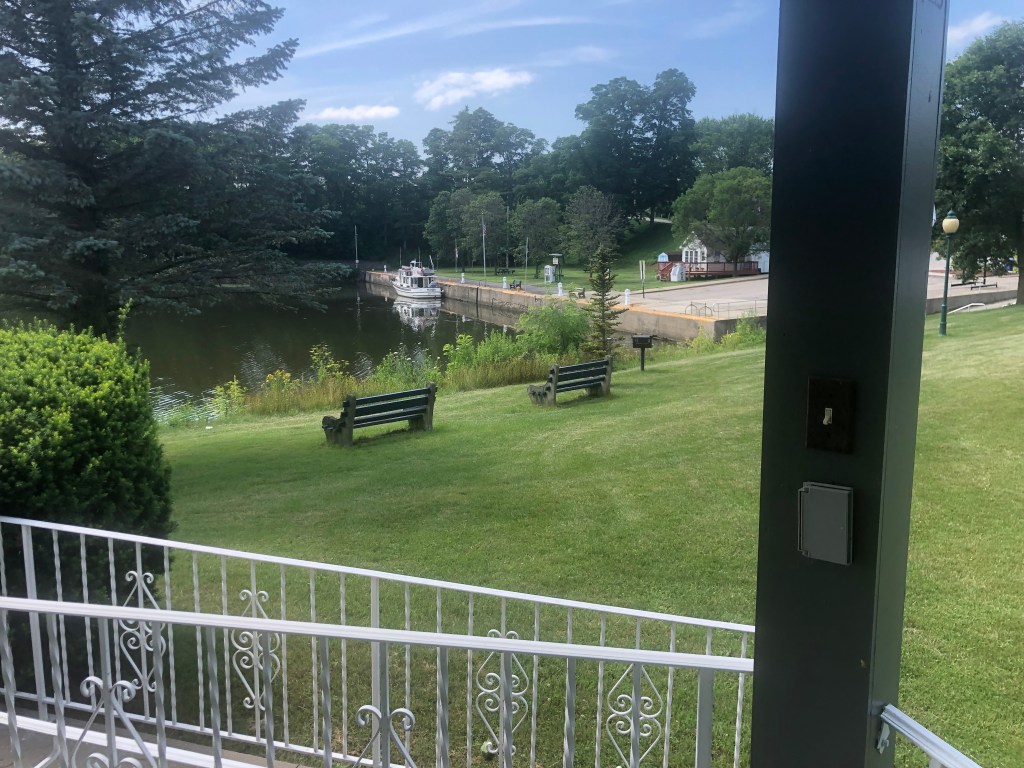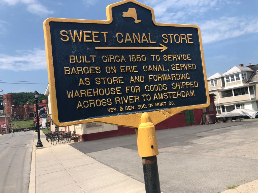 Amsterdam: Up early Friday morning to conquer the next section of locks (#8-10) on the canal. We arrived at Riverlink Park in Amsterdam. Another hot day!! Even the nights are warm!! At least 7 looper boats docked here tonight. There wasn’t much in the way of historical places to visit, so we walked over the river on the pedestrian bridge to the town on the south side of the river. There was a building that looked like a castle, but was originally built as an armory, but now used as an B&B hotel. We then walked back to the north side of the river on the sidewalk alongside the bridge for vehicles. We decided not to walk up the hill to see more of the city, but settled on walking to the hardware store for a few things. We must have looked out-of-place because the cashier said “are you boaters”. Maybe it was the sunglasses and boating hats that gave it away. We then walked over another pedestrian bridge (over the railway tracks) back to the park. Three bridges in one afternoon…. Docktails that evening with the loopers and then up to the on-site restaurant for dinner….should have gone back across the river for supper. Oh well–lesson learned. Did a load of laundry and off to bed…long day tomorrow.