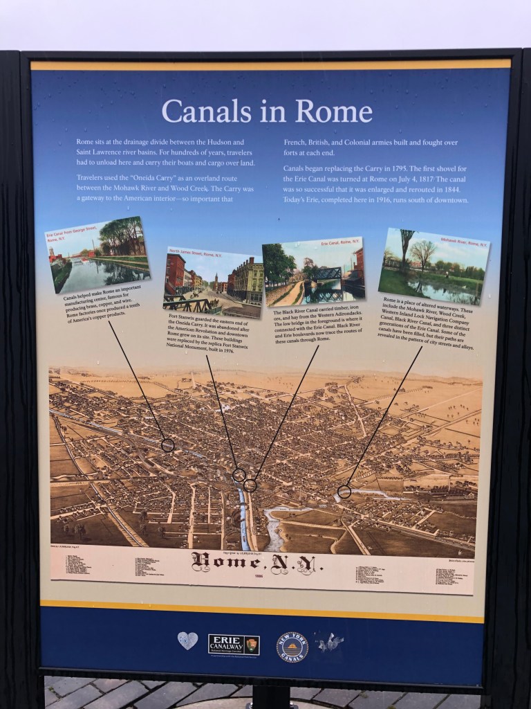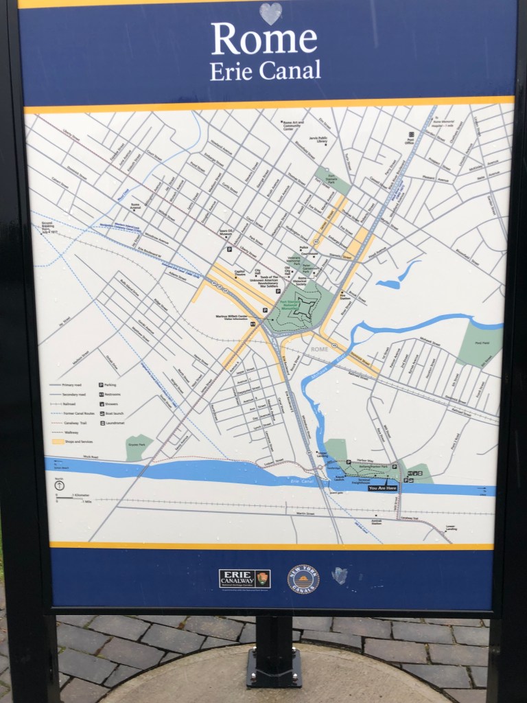 Rome: Locks 19-20. Our upstream elevation is 420 ft since we left the Hudson River. We stuck around Ilion until the office opened so we could get a pump-out. Once that was done we headed westward and enjoyed a cool day as well as a rainy day. Lots of rain and lots of flooding in places we had just visited. Thankful we are where we are, but feel for those who are experiencing hardship and loss. We are in Rome at a park with no services (no water or electric). Time to run the generator.