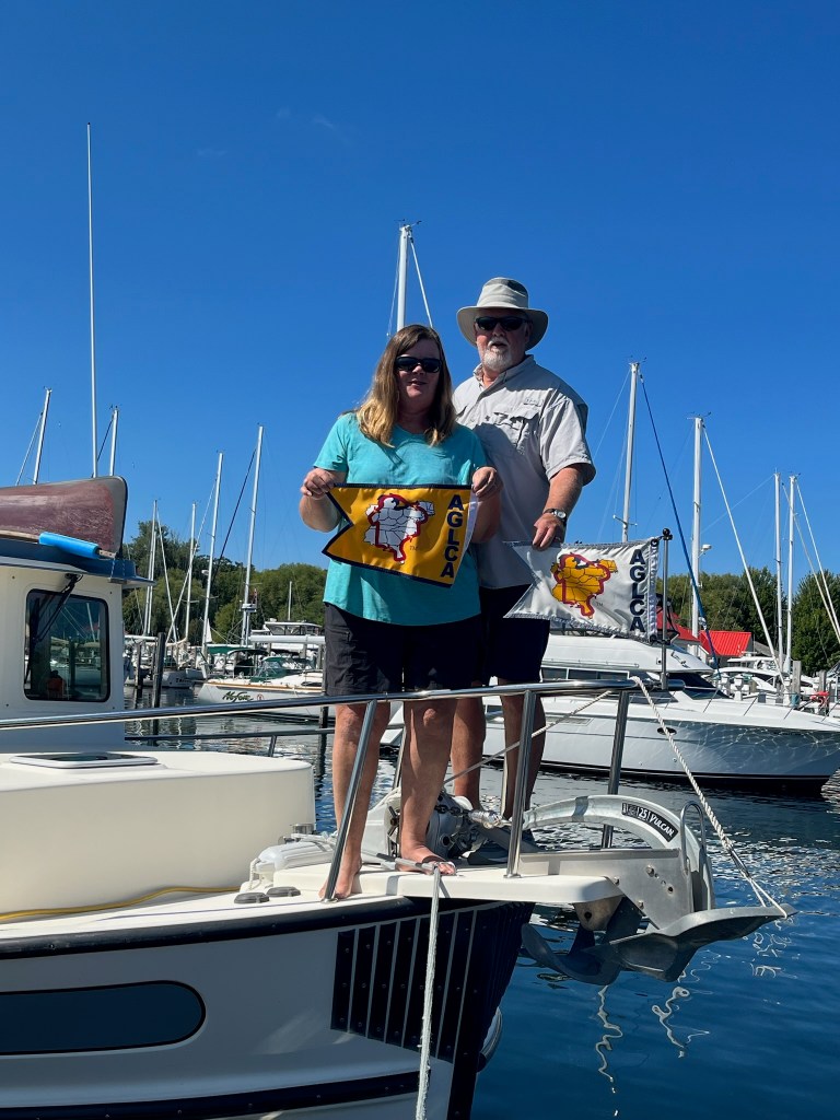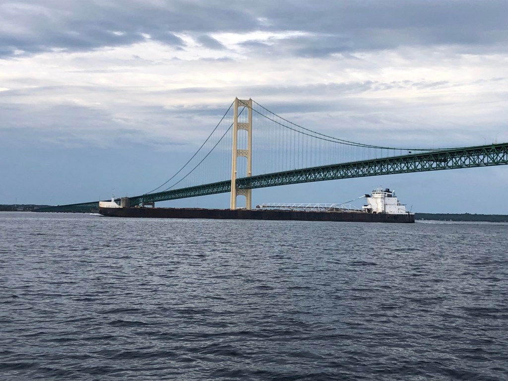 “Mighty Mac”: Today we crossed into Lake Michigan as we went under Mackinaw Bridge. Very different perspective cruising under it versus traveling over it by car. We could see the vehicles thru the grated roadbed. But before we crossed into Lake Michigan, we stopped to take a milestone picture with our looper flag, Martha (Me) and the bridge in the background. Hard to believe we’ve made it this far. Now on to Beaver Island. I’m holding the gold burgee in my hand–the one we can fly once we reach Northport.