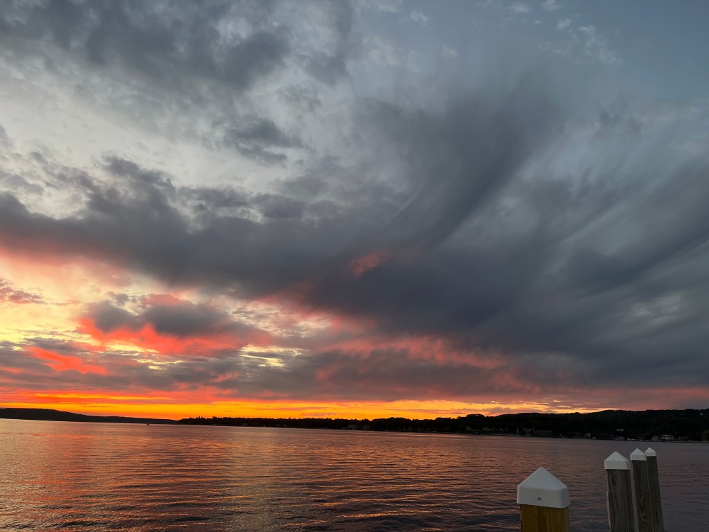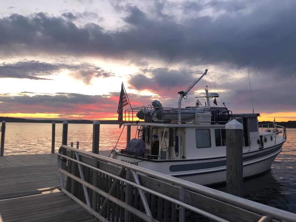 Boyne City: The next day we traveled down Lake Charlevoix towards Boyne City to attend the CRAM event to be held this weekend. Tim helped the boaters set up their boats while I toured the small downtown (lots of summers sales going on). The next day Tim helped the man on the committee boat from his dingy. Apparently the man was new to being the committee boat and Tim made it possible for the race to happen because of his help. That evening we had dinner at Ed & Tara’s house with several of the CRAM boaters as well as enjoyed time around the firepit in their yard. The next day, it was decided the wind was not sufficient to run more races, so the event was called and everyone went home early. For dinner we found a good Mexican restaurant and bought a few things at the grocery store. It was a nice marina, except we had to dock on the inside of a T-head because most of the slips didn’t have electric. But fortunately our spot did, even though we had to use extention cords. The sunsets were amazing. That evening we put all the toys (rowboat, dingy) back up on the boat in anticipation of our trip tomorrow to East Jordan.