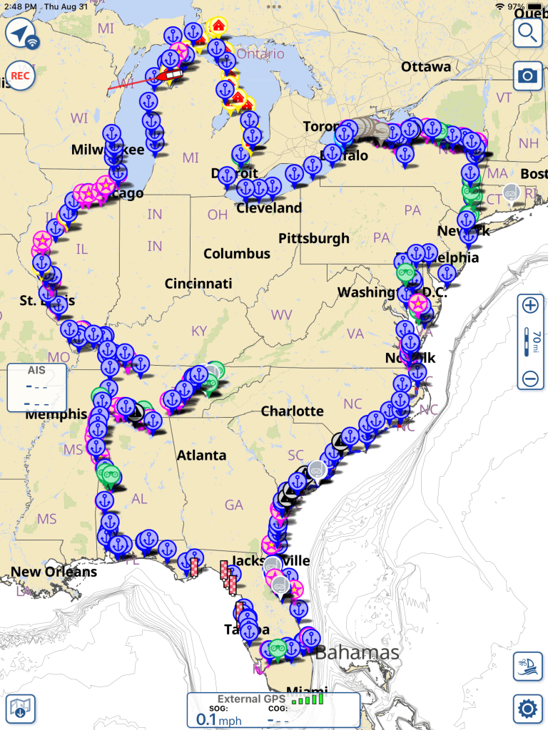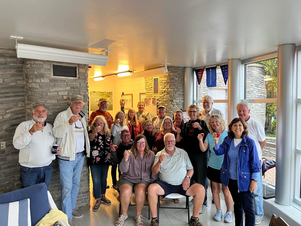 Traverse City/CenterPointe Marina: So strange to be cruising to our final destination after all those miles. We entered our marina quietly while Jay was using his drone to capture the moment. The crew from Walrus also greeted us but that was it. Later, many from the marina welcomed us back and we had a small gathering to celebrate with Preston, John, Jay and many others from the marina. So we are back, now what???? We plan to stay on the boat for about 10 days before we head to Grand Rapids for appointments, then Kailey’s and camp.